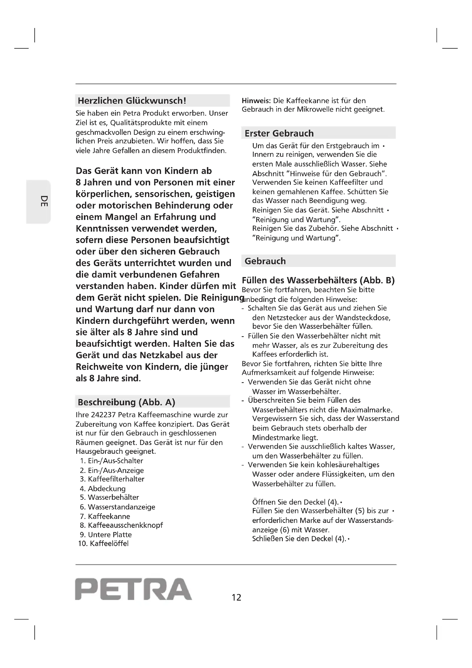 Herzlichen Glückwunsch! Sie haben ein Petra Produkt erworben. Unser Ziel ist es, Qualitätsprodukte mit einem geschmackvollen Design zu einem erschwing- lichen Preis anzubieten. Wir hoffen, dass Sie viele Jahre Gefallen an diesem Produktfinden. Das Gerät kann von Kindern ab 8 Jahren und von Personen mit einer körperlichen, sensorischen, geistigen oder motorischen Behinderung oder einem Mangel an Erfahrung und Kenntnissen verwendet werden, sofern diese Personen beaufsichtigt oder über den sicheren Gebrauch des Geräts unterrichtet wurden und die damit verbundenen Gefahren verstanden haben. Kinder dürfen mit dem Gerät nicht spielen. Die Reinigung und Wartung darf nur dann von Kindern durchgeführt werden, wenn sie älter als 8 Jahre sind und beaufsichtigt werden. Halten Sie das Gerät und das Netzkabel aus der Reichweite von Kindern, die jünger als 8 Jahre sind. Beschreibung (Abb. A) Ihre 242237 Petra Kaffeemaschine wurde zur Zubereitung von Kaffee konzipiert. Das Gerät ist nur für den Gebrauch in geschlossenen Räumen geeignet. Das Gerät ist nur für den Hausgebrauch geeignet.