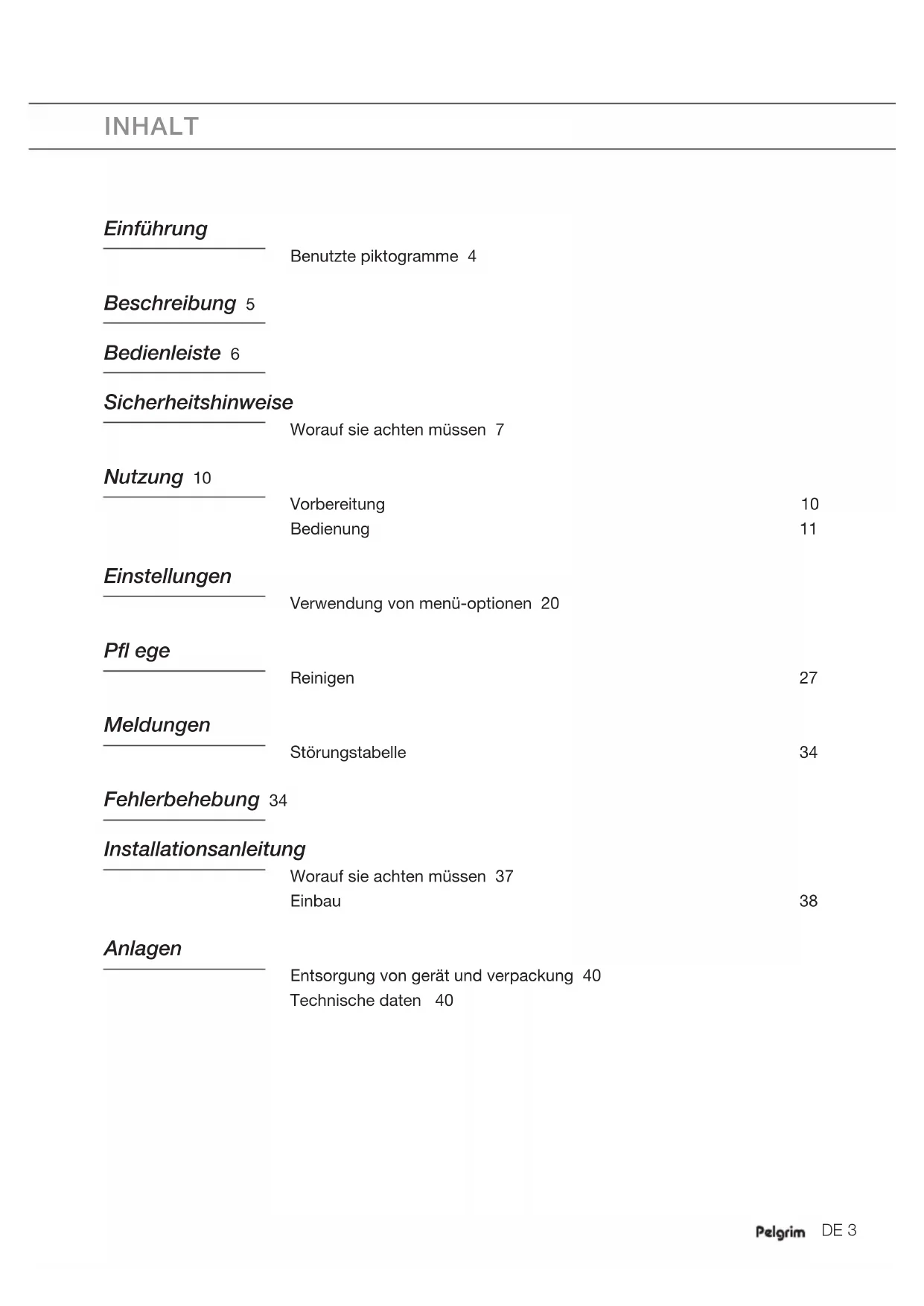 - Polypropylen-Band (PP) Diese Materialien sind umweltgerecht und nach den einschlägigen behördlichen Vorschriften zu entsorgen. Das Gerät ist mit einem durchgestrichenen Abfallbehälter markiert. Dies bedeutet, dass die getrennte Entsorgung vorgeschrieben ist, um negative Auswirkungen auf die Umwelt und die öffentliche Gesundheit zu vermeiden. Wenn das Gerät außer Betrieb genommen wird, müssen Sie es einer speziellen Entsorgungseinrichtung bei Ihrer Gemeinde oder Ihrem Händler übergeben. Die getrennte Entsorgung ermöglicht darüber hinaus die Wiedergewinnung von Materialien, die bei der Fertigung dieses Geräts verwendet wurden; dies spart Rohstoffe und Energie. Konformitätserklärung Wir erklären hiermit, dass unsere Produkte die einschlägigen Europäischen Richtlinien, Entscheidungen und Vorschriften und die Anforderungen der aufgeführten Normen erfüllen. EG-Verordnung 1275/2008 zum Bereitschaftszustand Technische Daten Typennummer, Energieart und Anschlusswert stehen auf dem Typenschild seitlich am Gerät.EN 3 CONTENTS Introduction Pictograms used 4 Description 5 Control panel 6 Safety instructions What you should pay attention to 7 Use Preparation 10 Operation 11 Settings Using menu options 20 Maintenance Cleaning 27 Messages Faults table 34 Troubleshooting 34 Installation instructions What you should pay attention to 37 Building in 38 Appendices Disposal of appliance and packaging 40 Technical data 40EN 4 INTRODUCTION This coffee machine will make delicious cups of coffee, espresso and cappuccino. You can customise the settings of the machine to suit your personal preferences and tastes. Coffee has been used in the factory to test the appliance and it is therefore completely normal that there are traces of coffee in the mill. This appliance is however guaranteed to be new. First read the user instructions carefully and completely before starting to use the appliance, and keep them carefully for future reference. Preventative maintenance Your coffee machine requires preventative maintenance. To guarantee that the coffee machine works well and reliably, Pelgrim recommends having the machine serviced once every 2 to 3 years (after a maximum 8,000 cups). Pictograms used Important information Danger! Elektrical appliance Danger of burns Tip The parts which could come into contact with coffee or milk conform to the provisions of the EEC directive 1935/2004 relating to materials suitable for contact with foodstuffs. This appliance is marked according to the European directive 2004/108/EC on Waste Electrical and Electronic Equipment (WEEE).EN 5 DESCRIPTION A. Main switch / Aa. On/Stand-by button B. Handles C. Nozzle D. Water tank (removable) E. Cup tray F. Drip tray grill (removable) G. Service door H. Height adjustable coffee dispenser