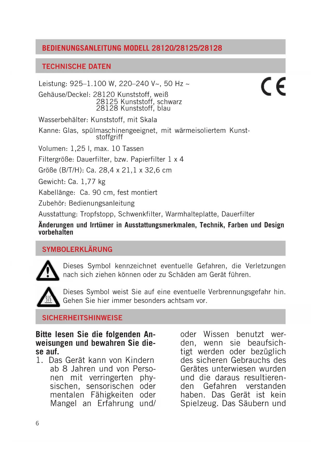 Diese Anleitung kann im Internet unter www.unold.de als pdf-Datei heruntergeladen werden. Hiermit erklärt die UNOLD AG, dass sich der Kaffeeautomat Compact 28120/28125/28128 in Übereinstimmung mit den grundlegenden Anforderungen der europäischen Richtlinie für elektromagnetische Verträglichkeit (2004/108/EC) und der Niederspannungsrichtlinie (2006/95/EC) bendet. Die Übereinstimmung mit den Regularien bezieht sich auf den Tag der Erstellung dieser Erklärung. Hockenheim, 1.8.2012 UNOLD AG, Mannheimer Straße 4, 68766 Hockenheim ten Wassers durchlaufen lassen, um alle Entkalkerrückstände zu beseitigen, da diese sonst den Kaffeegeschmack beeinträchti- gen könnten.13 MENAGROS SA Route der Servion CH - 1083 Mezières Telefon +41 (0) 21 9 03 01-15 Telefax +41 (0) 21 9 03 01-11 E-Mail info@menagros.ch Internet www.menagros.ch SERVICE-ADRESSEN DEUTSCHLAND ÖSTERREICH SCHWEIZ POLEN TSCHECHIEN Mannheimer Straße 4 68766 Hockenheim Kundendienst Telefon +49 (0) 62 05/94 18-27 Telefax +49 (0) 62 05/94 18-22 E-Mail service@unold.de Internet www.unold.de Reparaturabwicklung, Ersatzteile: ESC Electronic Service Center GmbH Molitorgasse 15 A-1110 Wien Telefon +43 (0) 1/9 71 70 59 Telefax +43 (0) 1/9 71 70 59 E-Mail office@esc-service.at „Quadra-net“ Sp. z o.o. Skadowa 5 61-888 Poznan Skadowa 5 Internet www.quadra-net.pl befree.cz s.r.o. Škroupova 150 537 01 Chrudim Telefon +42 0 46 46 01 881 E-Mail obchod@befree.cz Sie möchten innerhalb der Garantiezeit ein Gerät zur Reparatur einsenden? Auf unserer Internetseite www.unold.de/ruecksendung können Sie sich einen Rücksendeschein ausdrucken, um damit das Paket kostenlos bei der Post abzugeben (nur für Einsendungen aus Deutschland und Österreich).14 Power rating: 925–1,100 W, 220–240 V~, 50 Hz Housing / Lid: Model 28120 Plastic, white Model 28125 Plastic, black Model 28128 Plastic, blue Carafe: Glass, dishwasher proof, with isolated plastic handle Water tank: Plastic, with measuring scale Volume: 1.25 l, max. 10 cups Filter size: Permanent filter, optionally paper filter size 1 x 4 Size (W/D/H): Approx. 28.4 x 21.1 x 32.6 cm Weight: Approx. 1.77 kg Cable length: Approx. 90 cm Accessories: Instructions for use Features: Non-drip valve, swing filter, warming plate, permanent filter Equipment features, technology, colours and design are subject to change without notice. Errors and omissions excepted