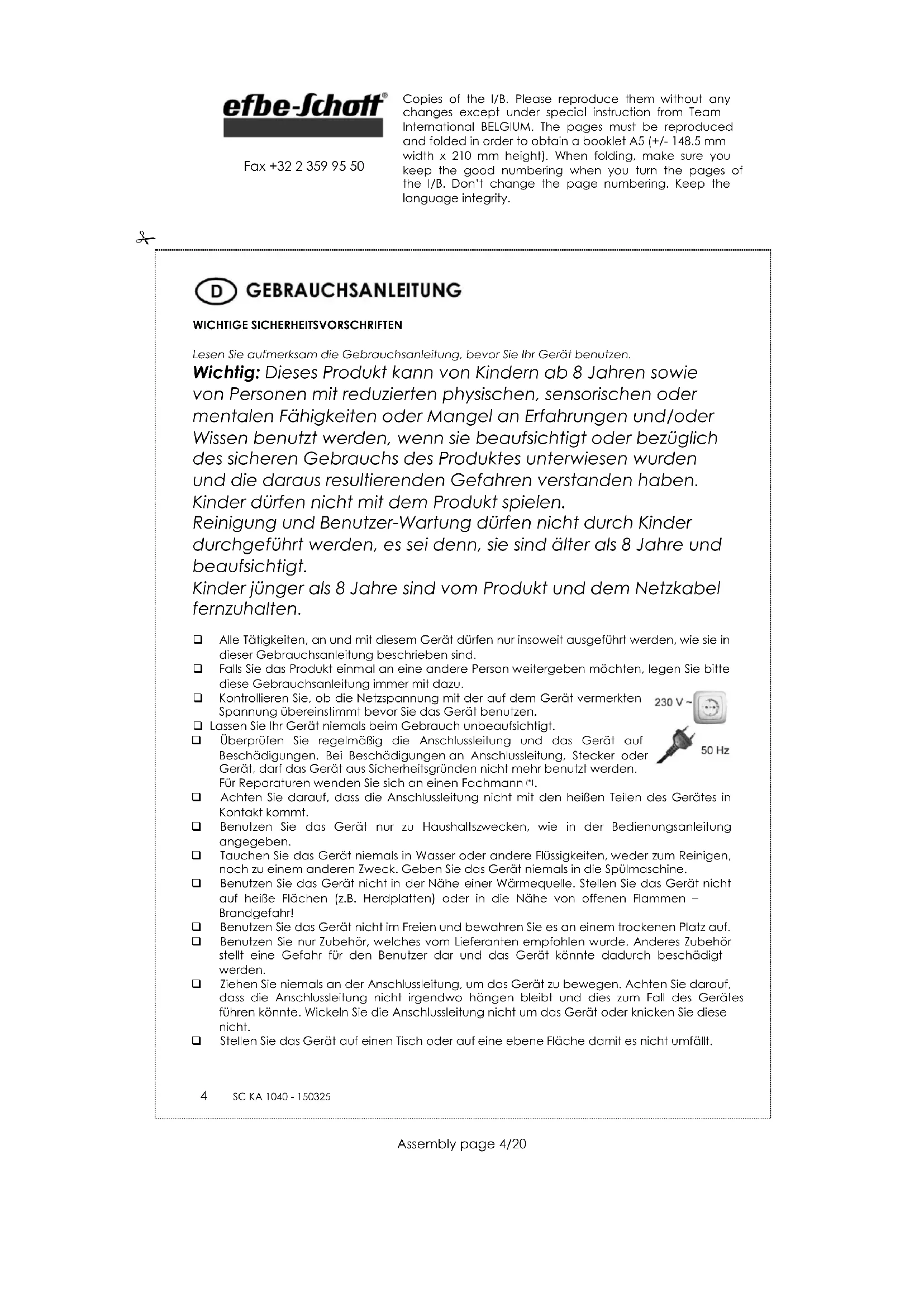 Achten Sie darauf, dass die Anschlussleitung nicht mit den heißen Teilen des Gerätes in Kontakt kommt. Benutzen Sie das Gerät nur zu Haushaltszwecken, wie in der Bedienungsanleitung angegeben. Tauchen Sie das Gerät niemals in Wasser oder andere Flüssigkeiten, weder zum Reinigen, noch zu einem anderen Zweck. Geben Sie das Gerät niemals in die Spülmaschine. Benutzen Sie das Gerät nicht in der Nähe einer Wärmequelle. Stellen Sie das Gerät nicht auf heiße Flächen (z.B. Herdplatten) oder in die Nähe von offenen Flammen – Brandgefahr! Benutzen Sie das Gerät nicht im Freien und bewahren Sie es an einem trockenen Platz auf. Benutzen Sie nur Zubehör, welches vom Lieferanten empfohlen wurde. Anderes Zubehör stellt eine Gefahr für den Benutzer dar und das Gerät könnte dadurch beschädigt werden. Ziehen Sie niemals an der Anschlussleitung, um das Gerät zu bewegen. Achten Sie darauf, dass die Anschlussleitung nicht irgendwo hängen bleibt und dies zum Fall des Gerätes führen könnte. Wickeln Sie die Anschlussleitung nicht um das Gerät oder knicken Sie diese nicht. Stellen Sie das Gerät auf einen Tisch oder auf eine ebene Fläche damit es nicht umfällt. Copies of the I/B. Please reproduce them without any changes except under special instruction from Team International BELGIUM. The pages must be reproduced and folded in order to obtain a booklet A5 (+/- 148.5 mm width x 210 mm height). When folding, make sure you keep the good numbering when you turn the pages of the I/B. Don’t change the page numbering. Keep the language integrity. 5 SC KA 1040 - 150325