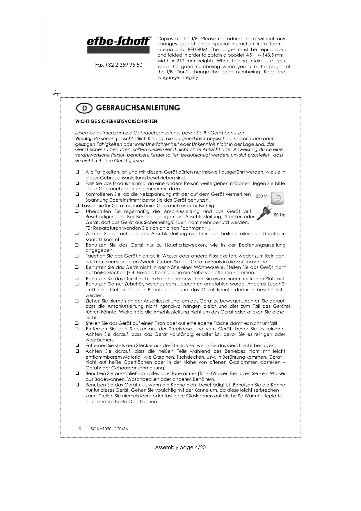 Achten Sie darauf, dass die Anschlussleitung nicht mit den heißen Teilen des Gerätes in Kontakt kommt. Benutzen Sie das Gerät nur zu Haushaltszwecken, wie in der Bedienungsanleitung angegeben. Tauchen Sie das Gerät niemals in Wasser oder andere Flüssigkeiten, weder zum Reinigen, noch zu einem anderen Zweck. Geben Sie das Gerät niemals in die Spülmaschine. Benutzen Sie das Gerät nicht in der Nähe einer Wärmequelle. Stellen Sie das Gerät nicht auf heiße Flächen (z.B. Herdplatten) oder in die Nähe von offenen Flammen. Benutzen Sie das Gerät nicht im Freien und bewahren Sie es an einem trockenen Platz auf. Benutzen Sie nur Zubehör, welches vom Lieferanten empfohlen wurde. Anderes Zubehör stellt eine Gefahr für den Benutzer dar und das Gerät könnte dadurch beschädigt werden. Ziehen Sie niemals an der Anschlussleitung, um das Gerät zu bewegen. Achten Sie darauf, dass die Anschlussleitung nicht irgendwo hängen bleibt und dies zum Fall des Gerätes führen könnte. Wickeln Sie die Anschlussleitung nicht um das Gerät oder knicken Sie diese nicht. Stellen Sie das Gerät auf einen Tisch oder auf eine ebene Fläche damit es nicht umfällt. Entfernen Sie den Stecker aus der Steckdose und vom Gerät, bevor Sie es reinigen. Achten Sie darauf, dass das Gerät vollständig erkaltet ist, bevor Sie es reinigen oder wegräumen. Entfernen Sie stets den Stecker aus der Steckdose, wenn Sie das Gerät nicht benutzen. Achten Sie darauf, dass die heißen Teile während des Betriebes nicht mit leicht entflammbarem Material, wie Gardinen, Tischdecken, usw. in Berührung kommen. Gerät nicht auf heiße Oberflächen oder in der Nähe von offenen Gasflammen abstellen – Gefahr der Gehäuseanschmelzung. Benutzen Sie ausschließlich kaltes oder lauwarmes (Trink-)Wasser. Benutzen Sie kein Wasser aus Badewannen, Waschbecken oder anderen Behältern. Benutzen Sie das Gerät nur, wenn die Kanne nicht beschädigt ist. Benutzen Sie die Kanne nur für dieses Gerät. Gehen Sie vorsichtig mit der Kanne um, da diese leicht zerbrechen kann. Stellen Sie niemals leere oder fast leere Glaskannen auf die heiße Warmhalteplatte oder andere heiße Oberflächen. Copies of the I/B. Please reproduce them without any changes except under special instruction from Team International BELGIUM. The pages must be reproduced and folded in order to obtain a booklet A5 (+/- 148.5 mm width x 210 mm height). When folding, make sure you keep the good numbering when you turn the pages of the I/B. Don’t change the page numbering. Keep the language integrity. 5 SC KA1030 - 120416