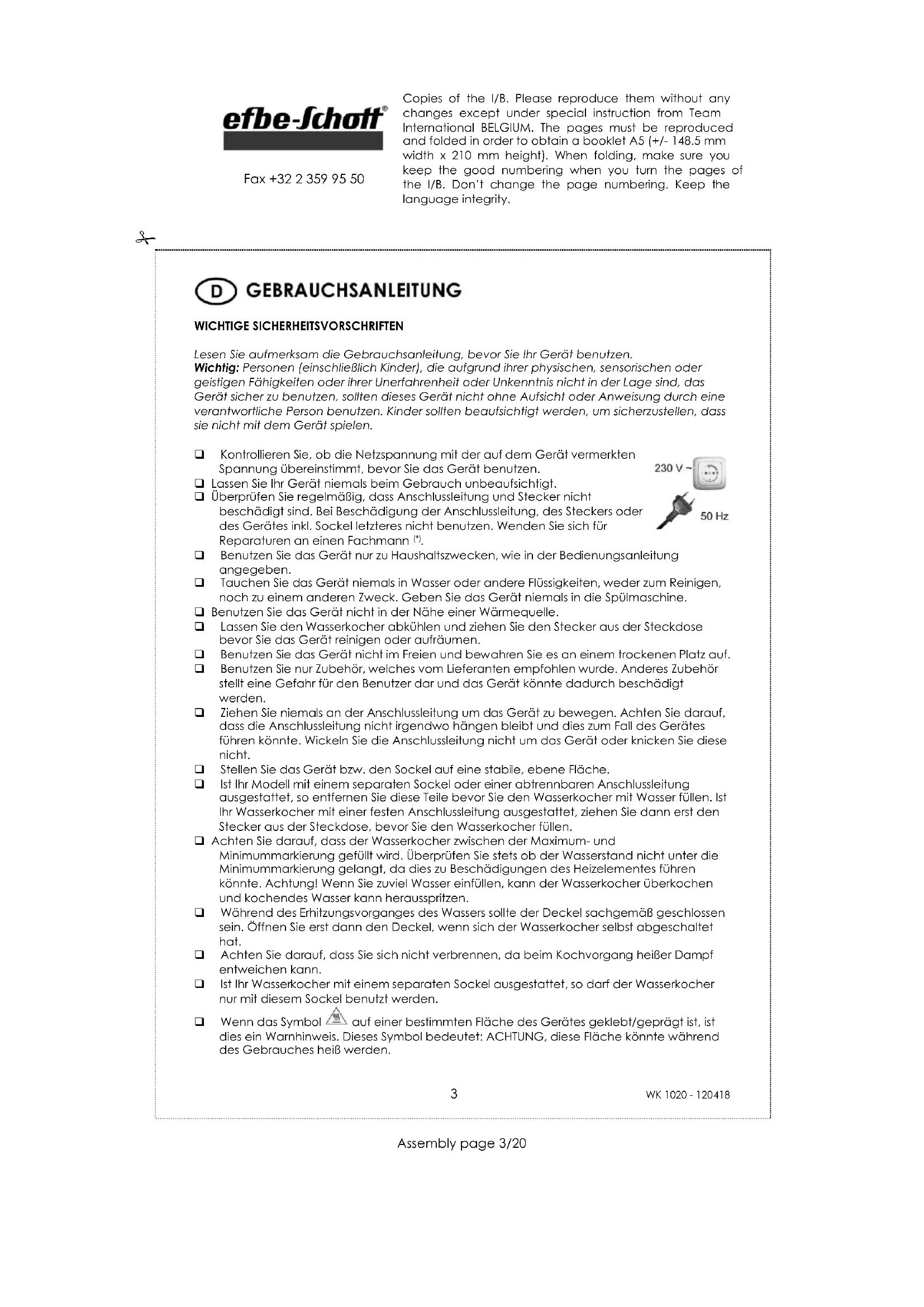Benutzen Sie das Gerät nur zu Haushaltszwecken, wie in der Bedienungsanleitung angegeben. Tauchen Sie das Gerät niemals in Wasser oder andere Flüssigkeiten, weder zum Reinigen, noch zu einem anderen Zweck. Geben Sie das Gerät niemals in die Spülmaschine. Benutzen Sie das Gerät nicht in der Nähe einer Wärmequelle. Lassen Sie den Wasserkocher abkühlen und ziehen Sie den Stecker aus der Steckdose bevor Sie das Gerät reinigen oder aufräumen. Benutzen Sie das Gerät nicht im Freien und bewahren Sie es an einem trockenen Platz auf. Benutzen Sie nur Zubehör, welches vom Lieferanten empfohlen wurde. Anderes Zubehör stellt eine Gefahr für den Benutzer dar und das Gerät könnte dadurch beschädigt werden. Ziehen Sie niemals an der Anschlussleitung um das Gerät zu bewegen. Achten Sie darauf, dass die Anschlussleitung nicht irgendwo hängen bleibt und dies zum Fall des Gerätes führen könnte. Wickeln Sie die Anschlussleitung nicht um das Gerät oder knicken Sie diese nicht. Stellen Sie das Gerät bzw. den Sockel auf eine stabile, ebene Fläche. Ist Ihr Modell mit einem separaten Sockel oder einer abtrennbaren Anschlussleitung ausgestattet, so entfernen Sie diese Teile bevor Sie den Wasserkocher mit Wasser füllen. Ist Ihr Wasserkocher mit einer festen Anschlussleitung ausgestattet, ziehen Sie dann erst den Stecker aus der Steckdose, bevor Sie den Wasserkocher füllen. Achten Sie darauf, dass der Wasserkocher zwischen der Maximum- und Minimummarkierung gefüllt wird. Überprüfen Sie stets ob der Wasserstand nicht unter die Minimummarkierung gelangt, da dies zu Beschädigungen des Heizelementes führen könnte. Achtung! Wenn Sie zuviel Wasser einfüllen, kann der Wasserkocher überkochen und kochendes Wasser kann herausspritzen. Während des Erhitzungsvorganges des Wassers sollte der Deckel sachgemäß geschlossen sein. Öffnen Sie erst dann den Deckel, wenn sich der Wasserkocher selbst abgeschaltet hat. Achten Sie darauf, dass Sie sich nicht verbrennen, da beim Kochvorgang heißer Dampf entweichen kann. Ist Ihr Wasserkocher mit einem separaten Sockel ausgestattet, so darf der Wasserkocher nur mit diesem Sockel benutzt werden. Wenn das Symbol auf einer bestimmten Fläche des Gerätes geklebt/geprägt ist, ist dies ein Warnhinweis. Dieses Symbol bedeutet: ACHTUNG, diese Fläche könnte während des Gebrauches heiß werden. Copies of the I/B. Please reproduce them without any changes except under special instruction from Team International BELGIUM. The pages must be reproduced and folded in order to obtain a booklet A5 (+/- 148.5 mm width x 210 mm height). When folding, make sure you keep the good numbering when you turn the pages of the I/B. Don’t change the page numbering. Keep the language integrity. 4 WK 1020 - 120418