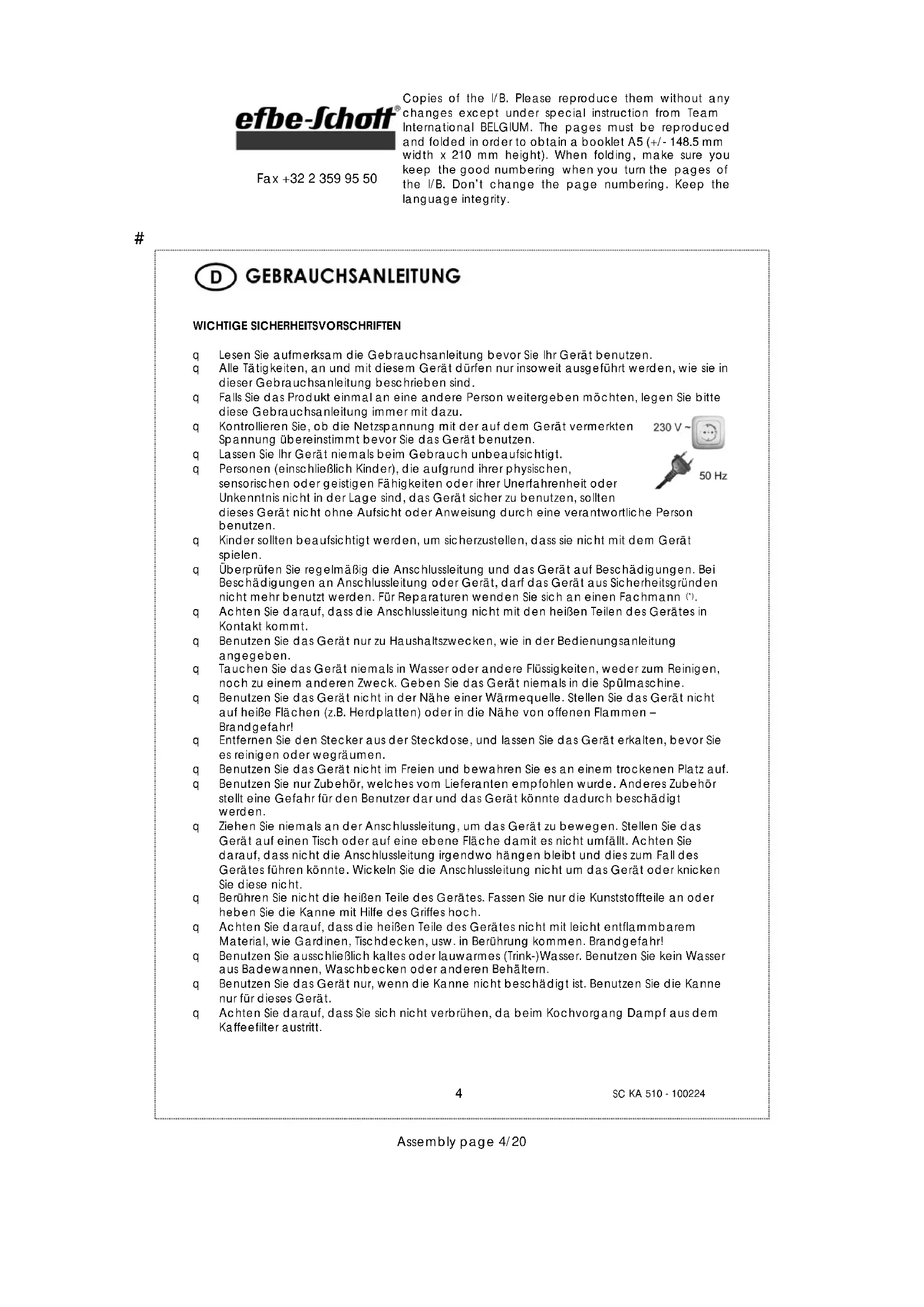 Zum Schutz unserer Umwelt und unserer Gesundheit sind Elektro- und Elektronik-Altgeräte nach bestimmten Regeln zu entsorgen. Dies fordert den Einsatz sowohl des Herstellers bzw. Lieferanten als auch des Verbrauchers. Aus diesem Grund darf dieses Gerät, wie das Symbol auf dem Typenschild bzw. auf der Verpackung zeigt, nicht in den unsortierten Restmüll gegeben werden. Der Verbraucher hat das Recht, dieses Gerät kostenfrei über kommunale Sammelstellen zu entsorgen; von dort aus wird die spezifische Behandlung, Verwertung bzw. das Recycling gem. den Erfordernissen der Richtlinie sichergestellt.# Copies of the I/B. Please reproduce them without any changes except under special instruction from Team International BELGIUM. The pages must be reproduced and folded in order to obtain a booklet A5 (+/- 148.5 mm width x 210 mm height). When folding, make sure you keep the good numbering when you turn the pages of the I/B. Don’t change the page numbering. Keep the language integrity.