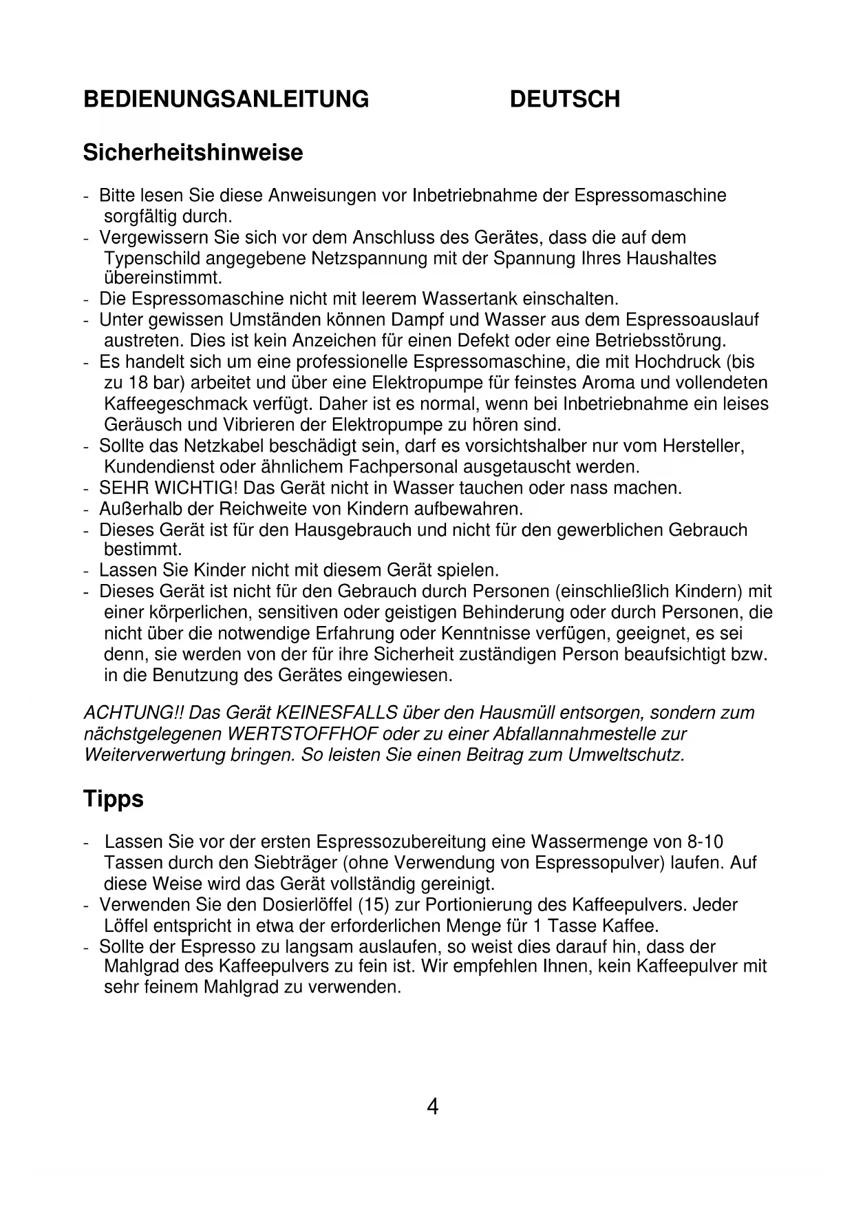 -itte lessen Sie these Anweisungen vor Inbetriebnahme der Espressomaschinesorgfaltig durch.