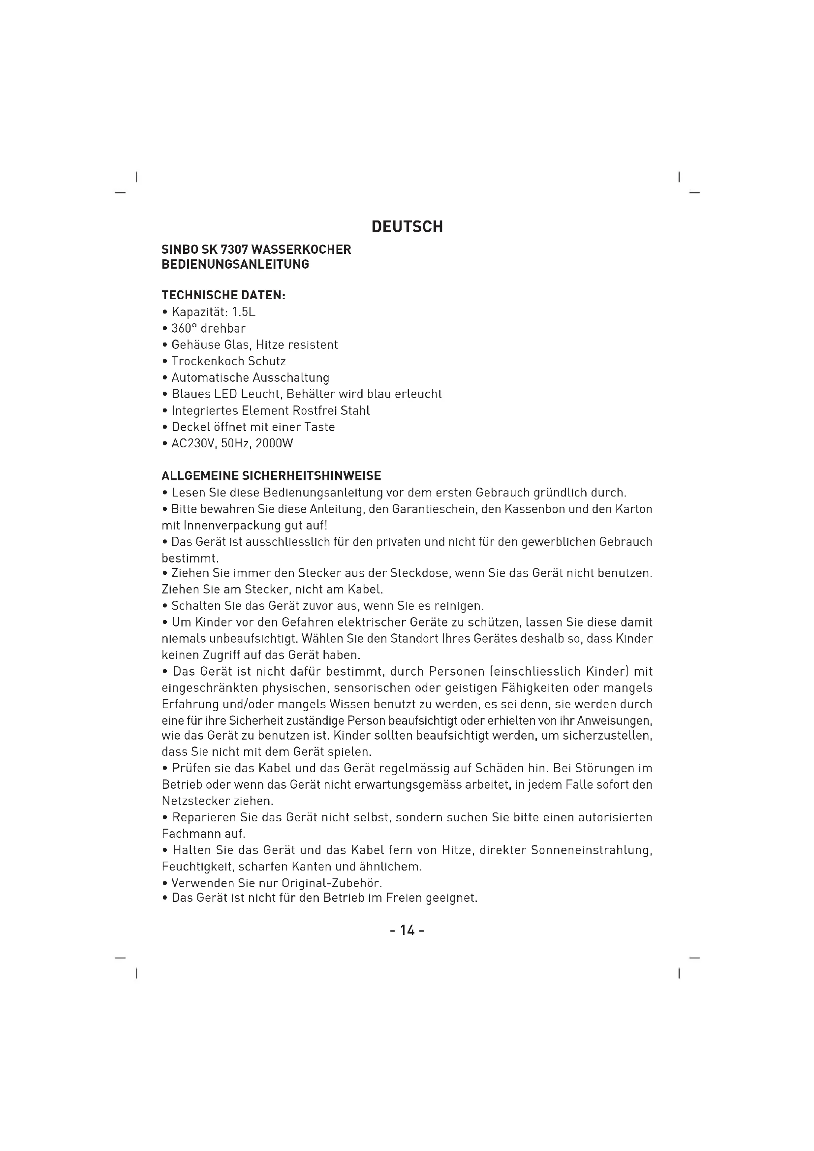SK7307 - Wasserkocher SINBO - Kostenlose Bedienungsanleitung