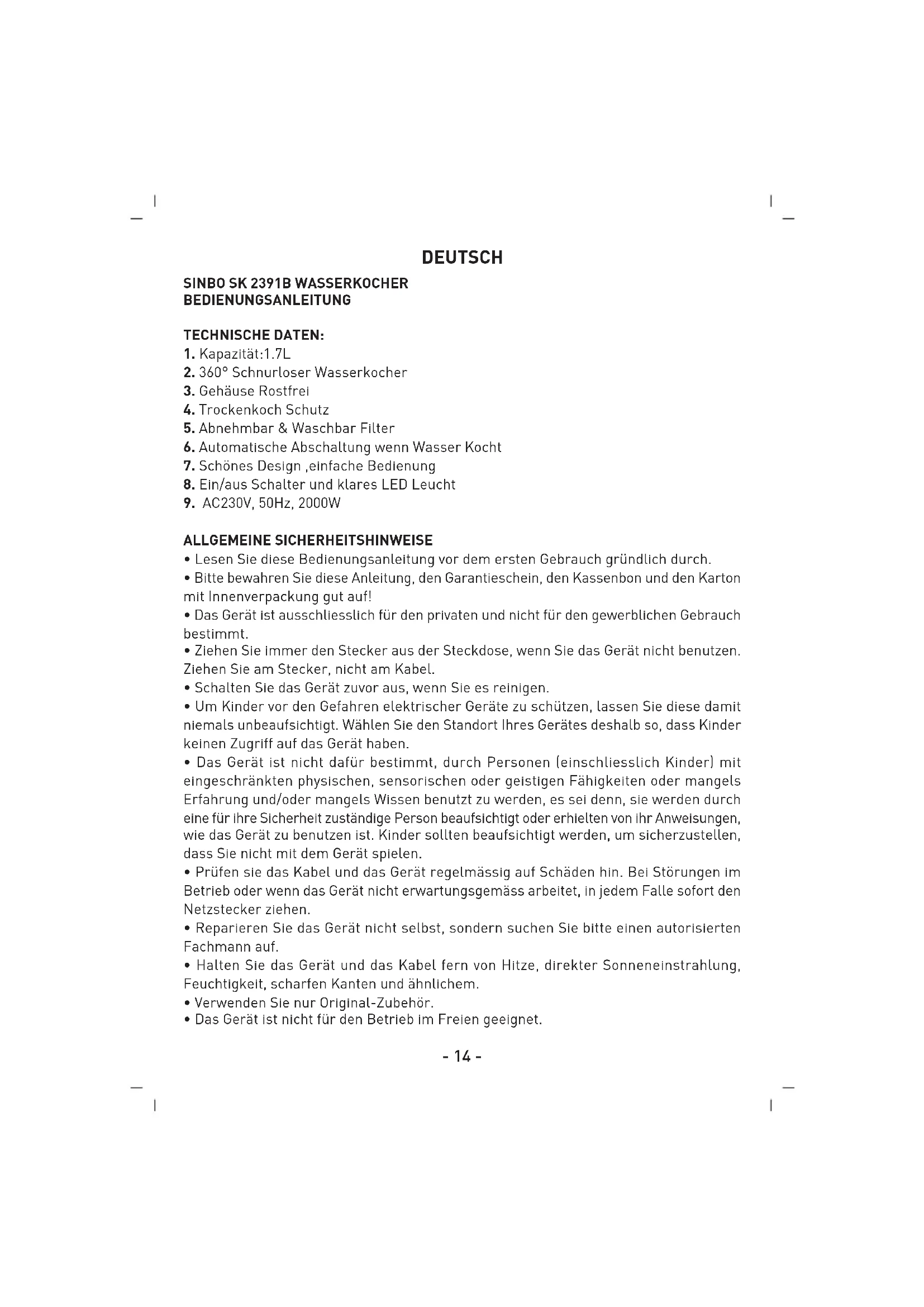 SK2391 - Wasserkocher SINBO - Kostenlose Bedienungsanleitung
