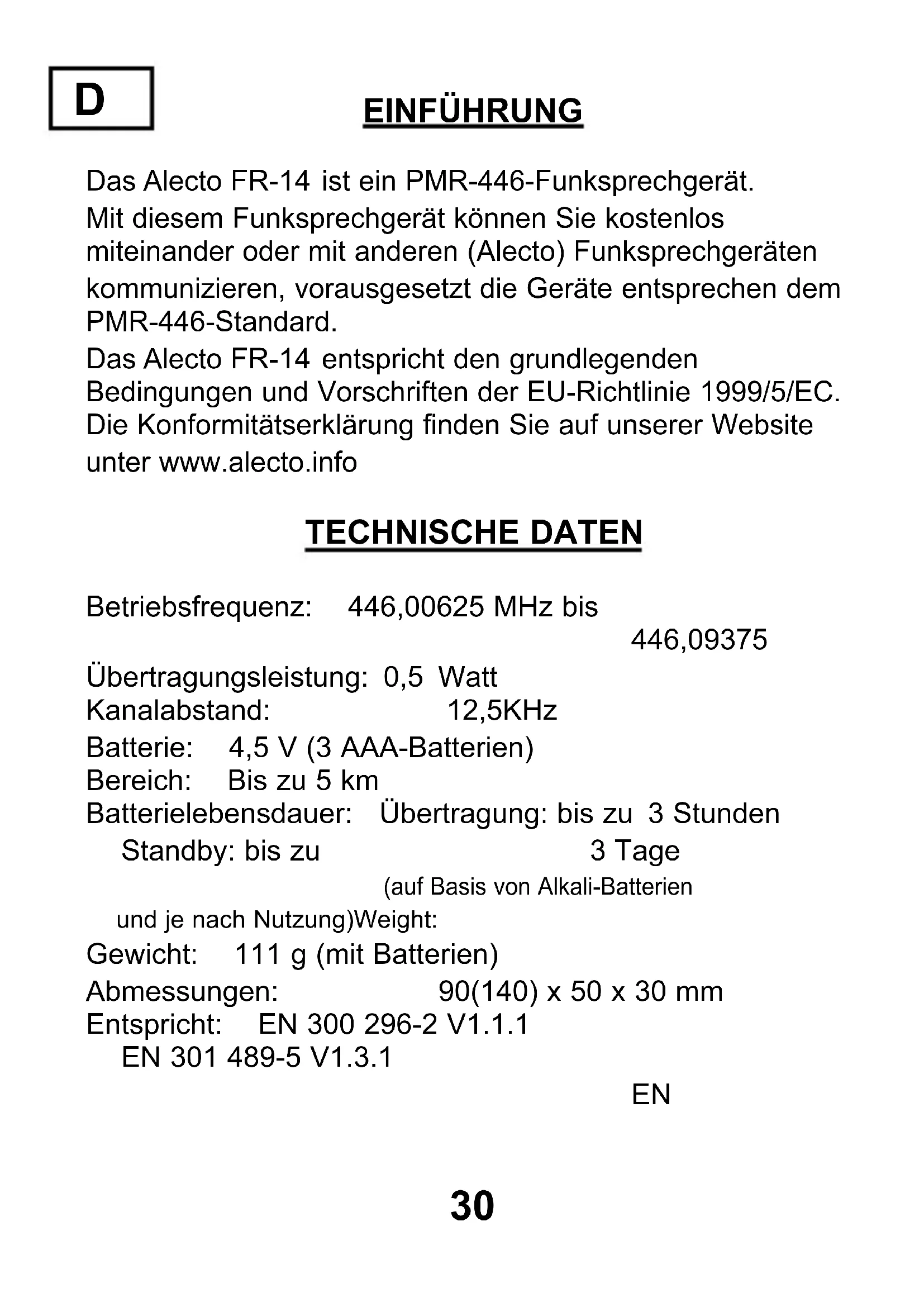 ALLGEMEIN: Das FR-14 ist ein Sender/Empfänger, der Radiowellen im 446-MHz-Band nutzt. Es kann zu Interferenzen bei der Signalübertragung durch externe Einflüsse wie andere Funksprechgeräte, Sender, drahtlose Telefone usw. kommen. Wenn Ihr Funksprechgerät von einer Interferenz betroffen ist oder eine Interferenz verursacht, kann es helfen, auf einen andere Kanal zu wechseln. Die Verwendung dieses Funksprechgeräts ist in allen EU-Ländern erlaubt. Wenn Sie mit Ihrem FR-14 in Länder außerhalb der EU reisen möchten, informieren Sie sich bitte über die lokalen Beschränkungen zur Verwendung von PMR446-Geräten. Seien Sie sich bewusst, dass das Signal von Ihrem FR-14 auch von anderen Funksprechgeräten oder Empfängern empfangen werden kann. Es ist nicht erlaubt, Modifizierungen an der Elektronik oder der Antenne des FR-14 vorzunehmen. Wartungs- und Servicearbeiten müssen immer von qualifizierten Technikern durchgeführt werden. Verwenden Sie das FR-14 nie während eines Gewitters im Freien.38 WARTUNG: - Verwenden Sie zum Reinigen des FR-14 ein feuchtes Tuch. - Stellen Sie das Funksprechgerät nie in das direkte Sonnenlicht oder in eine feuchte Umgebung. - Achten Sie darauf, dass kein Wasser und/oder Sand in das FR-14 eindringt. - Wenn das FR-14 nicht funktioniert, überprüfen Sie zuerst, ob es an einem anderen Ort funktioniert. FUNKVERBINDUNG: Das FR-14 hat einen Empfangsbereich von bis zu 5 km. Der Bereich hängt von den lokalen Bedienungen, zum Beispiel dem Vorhandensein hoher Gebäude, Hochspannungsleitungen und Freileitungskabel, ab. Der optimale Bereich wird erreicht, wenn sich keine Hindernisse zwischen den beiden Funksprechgeräten befinden. UMWELTSCHUTZ: Geben Sie das Funksprechgerät zur Entsorgung Ihrem Händler zurück. Er wird sicherstellen, dass es auf umweltfreundliche Weise entsorgt wird.39 GARANTIE Das Alecto FR-14 wird einer 24-monatigen Garantie ab Kaufdatum geliefert. In diesem Zeitraum garantieren wir kostenlose Reparaturen bei Material- und Fertigungsfehlern. Dies liegt im Ermessen des Importeurs. DAS SOLLTEN SIE TUN: Wenn Sie einen Defekt bemerken, sehen Sie zuerst im Handbuch nach. Wenn Sie das Problem dadurch nicht beheben können, wenden Sie sich an den Händler Ihres Funksprechgeräts oder die Alecto-Serviceabteilung (Telefon: +31 (0)73 6411 355). DIE GARANTIE ERLISCHT: Bei unsachgemäßem Gebrauch, falscher Verbindung, auslaufenden und/oder falsch eingelegten Batterien, Verwendung von Nicht-OEM-Teilen oder -Zubehör, Fahrlässigkeit oder Fehler, die durch Feuchtigkeit, Feuer, Fluten, Blitze und Naturkatastrophen verursacht werden. Bei nicht autorisierten Modifizierungen und/ oder Reparaturen durch Dritte. Bei Verwendung nicht geeigneter Verpackung für den Transport des Geräts und wenn das Gerät nicht von einem Nachweis dieser Garantie zusammen mit Ihrem Kaufnachweis begleitet wird. Batterien und Antenne sind nicht in der Garantie enthalten. Jegliche weitere Haftung, insbesondere in Bezug auf Folgeverluste, ist ausgeschlossen.40 ÚVOD Alecto FR-14 je vysílací a pijímací rádiový pístroj standardu PMR 446. Tento vysílací a pijímací rádiový pístroj (vysílaka) vám umožní bezplatn komunikovat s druhým pístrojem nebo s dalšími vysílakami (Alecto) za pedpokladu, že ostatní pístroje splují standardy PMR 446. Alecto FR-14 vyhovuje nezbytným podmínkám a ustanovením, které jsou popsané ve smrnici EU 1999/5/ES. Prohlášení o shodn najdete na našem webu www.alecto.info TECHNICKÉ ÚDAJE Provozní frekvence: 446,00625 MHz až 446,09375 MHz Vysílací výkon: 0,5 W Odstup kanál: 12,5 kHz Baterie: 4,5 V (3 baterie AAA) Dosah: až 5 km Životnost baterie: vysílání: až 3 hodiny pohotovostní režim: až 3 dny (údaje vychází z použití alkalických baterií a závisí na zpsobu použití) Hmotnost: 111 g (vetn baterií) Rozmry: 90 (140) x 50 x 30 mm Spluje: EN 300 296-2 V1.1.1 EN 301 489-5 V1.3.1 EN 60065:2002 CZ41