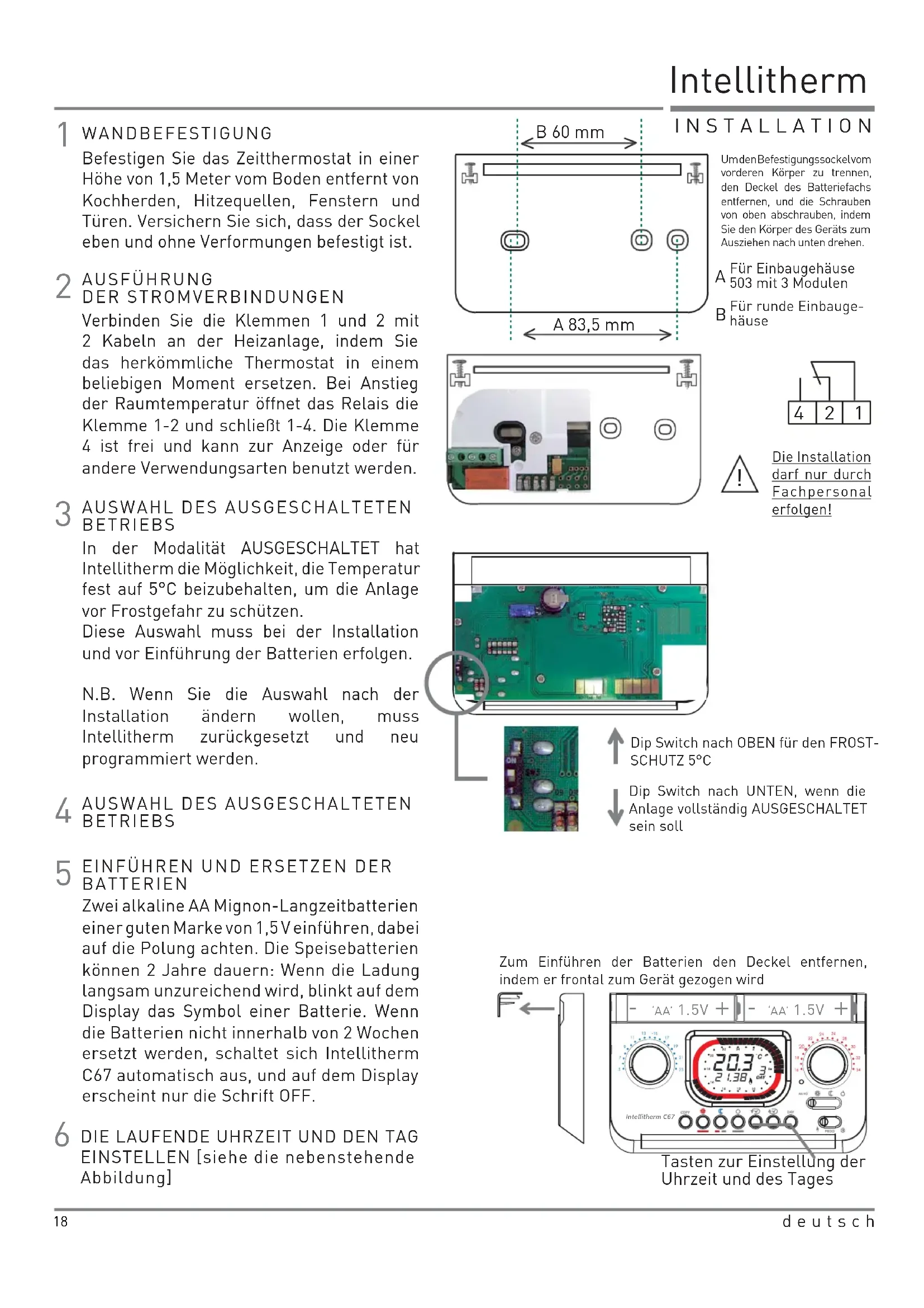 EINFÜHREN UND ERSETZEN DER BATTERIENZwei alkaline AA Mignon-Langzeitbatterien einer guten Marke von 1,5 V einführen, dabei auf die Polung achten. Die Speisebatterien können 2 Jahre dauern: Wenn die Ladung langsam unzureichend wird, blinkt auf dem Display das Symbol einer Batterie. Wenn die Batterien nicht innerhalb von 2 Wochen ersetzt werden, schaltet sich Intellitherm C67 automatisch aus, und auf dem Display erscheint nur die Schrift OFF.Um den Befestigungssockel vom vorderen Körper zu trennen, den Deckel des Batteriefachs entfernen, und die Schrauben von oben abschrauben, indem Sie den Körper des Geräts zum Ausziehen nach unten drehen. AUSFÜHRUNG DER STROMVERBINDUNGENVerbinden Sie die Klemmen 1 und 2 mit 2 Kabeln an der Heizanlage, indem Sie das herkömmliche Thermostat in einem beliebigen Moment ersetzen. Bei Anstieg der Raumtemperatur öffnet das Relais die Klemme 1-2 und schließt 1-4. Die Klemme 4 ist frei und kann zur Anzeige oder für andere Verwendungsarten benutzt werden. AUSWAHL DES AUSGESCHALTETEN BETRIEBSIn der Modalität AUSGESCHALTET hat Intellitherm die Möglichkeit, die Temperatur fest auf 5°C beizubehalten, um die Anlage vor Frostgefahr zu schützen.Diese Auswahl muss bei der Installation und vor Einführung der Batterien erfolgen.N.B. Wenn Sie die Auswahl nach der Installation ändern wollen, muss Intellitherm zurückgesetzt und neu programmiert werden.Dip Switch nach OBEN für den FROST-SCHUTZ 5°CDip Switch nach UNTEN, wenn die Anlage vollständig AUSGESCHALTET sein soll WANDBEFESTIGUNGDie Installation darf nur durch Fachpersonal erfolgen!Befestigen Sie das Zeitthermostat in einer Höhe von 1,5 Meter vom Boden entfernt von Kochherden, Hitzequellen, Fenstern und Türen. Versichern Sie sich, dass der Sockel eben und ohne Verformungen befestigt ist.Für Einbaugehäuse 503 mit 3 ModulenFür runde Einbauge-häuse