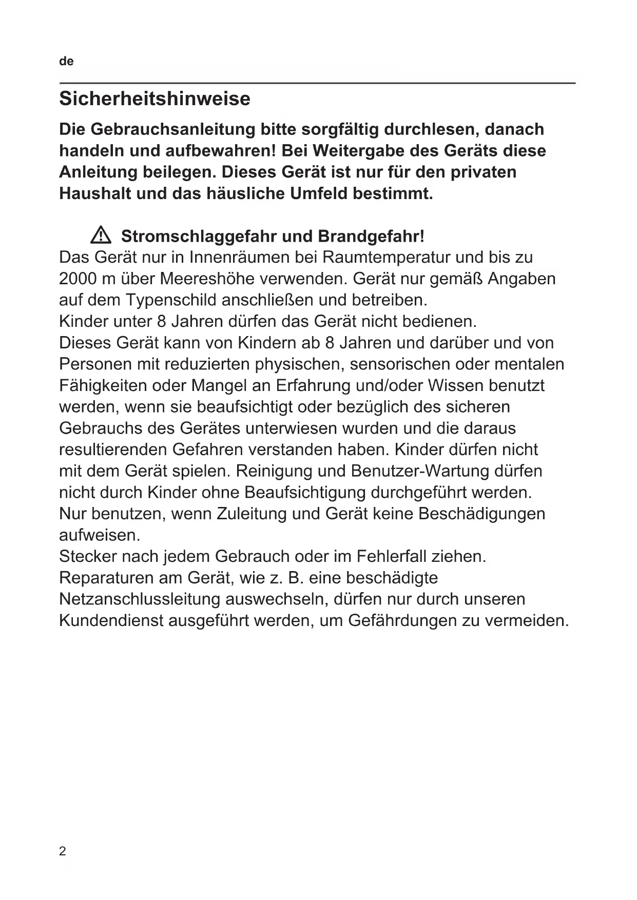 Sicherheitshinweise Die Gebrauchsanleitung bitte sorgfältig durchlesen, danach handeln und aufbewahren! Bei Weitergabe des Geräts diese Anleitung beilegen. Dieses Gerät ist nur für den privaten Haushalt und das häusliche Umfeld bestimmt. W Stromschlaggefahr und Brandgefahr! Das Gerät nur in Innenräumen bei Raumtemperatur und bis zu 2000 m über Meereshöhe verwenden. Gerät nur gemäß Angaben auf dem Typenschild anschließen und betreiben. Kinder unter 8 Jahren dürfen das Gerät nicht bedienen. Dieses Gerät kann von Kindern ab 8 Jahren und darüber und von Personen mit reduzierten physischen, sensorischen oder mentalen Fähigkeiten oder Mangel an Erfahrung und/oder Wissen benutzt werden, wenn sie beaufsichtigt oder bezüglich des sicheren Gebrauchs des Gerätes unterwiesen wurden und die daraus resultierenden Gefahren verstanden haben. Kinder dürfen nicht mit dem Gerät spielen. Reinigung und Benutzer-Wartung dürfen nicht durch Kinder ohne Beaufsichtigung durchgeführt werden. Nur benutzen, wenn Zuleitung und Gerät keine Beschädigungen aufweisen. Stecker nach jedem Gebrauch oder im Fehlerfall ziehen. Reparaturen am Gerät, wie z. B. eine beschädigte Netzanschlussleitung auswechseln, dürfen nur durch unseren Kundendienst ausgeführt werden, um Gefährdungen zu vermeiden.3