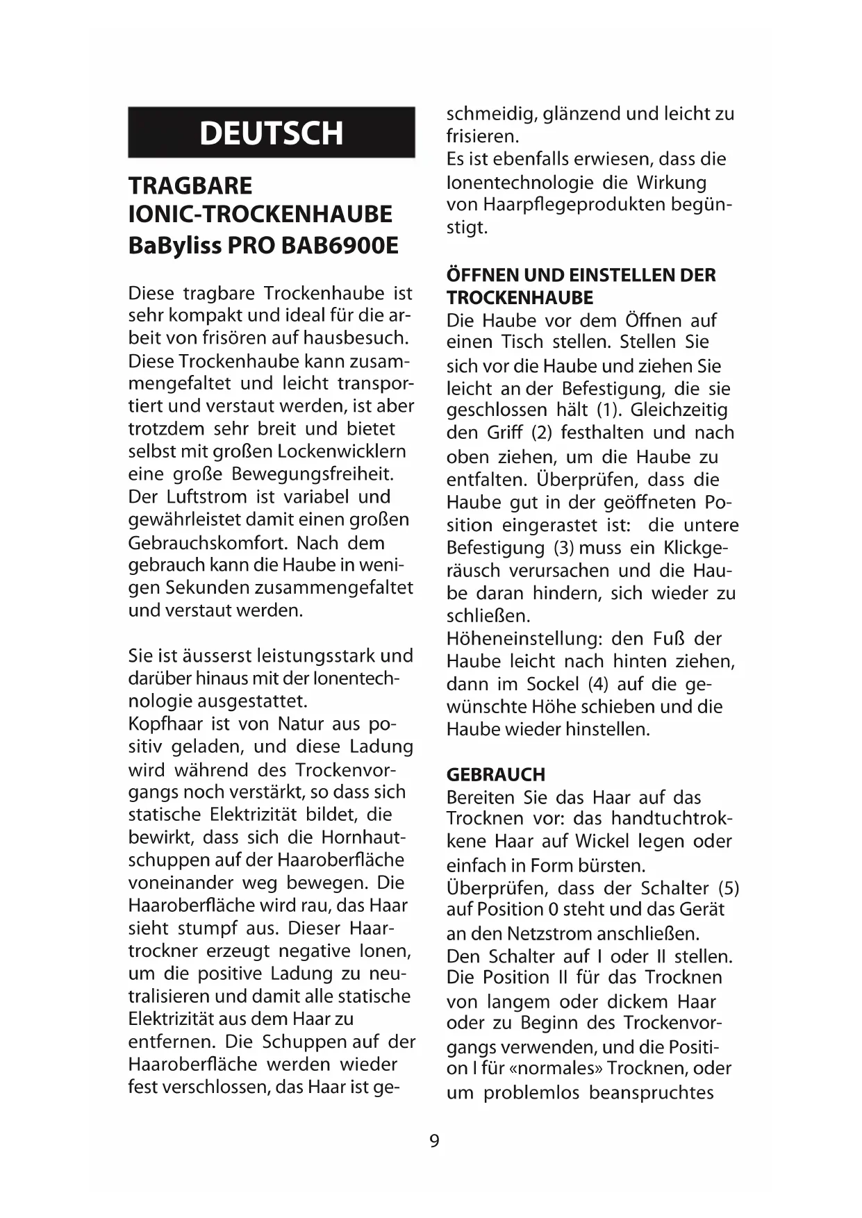 - Use the return and collection sys- tems available in your area. Some material can be recycled or recovered.9 TRAGBARE IONIC-TROCKENHAUBE BaByliss PRO BAB6900E Diese tragbare Trockenhaube ist sehr kompakt und ideal für die ar- beit von frisören auf hausbesuch. Diese Trockenhaube kann zusam- mengefaltet und leicht transpor- tiert und verstaut werden, ist aber trotzdem sehr breit und bietet selbst mit großen Lockenwicklern eine große Bewegungsfreiheit. Der Luftstrom ist variabel und gewährleistet damit einen großen Gebrauchskomfort. Nach dem gebrauch kann die Haube in weni- gen Sekunden zusammengefaltet und verstaut werden. Sie ist äusserst leistungsstark und darüber hinaus mit der Ionentech- nologie ausgestattet. Kopfhaar ist von Natur aus po- sitiv geladen, und diese Ladung wird während des Trockenvor- gangs noch verstärkt, so dass sich statische Elektrizität bildet, die bewirkt, dass sich die Hornhaut- schuppen auf der Haaroberfläche voneinander weg bewegen. Die Haaroberfläche wird rau, das Haar sieht stumpf aus. Dieser Haar- trockner erzeugt negative Ionen, um die positive Ladung zu neu- tralisieren und damit alle statische Elektrizität aus dem Haar zu entfernen. Die Schuppen auf der Haaroberfläche werden wieder fest verschlossen, das Haar ist ge- schmeidig, glänzend und leicht zu frisieren. Es ist ebenfalls erwiesen, dass die Ionentechnologie die Wirkung von Haarpflegeprodukten begün- stigt.