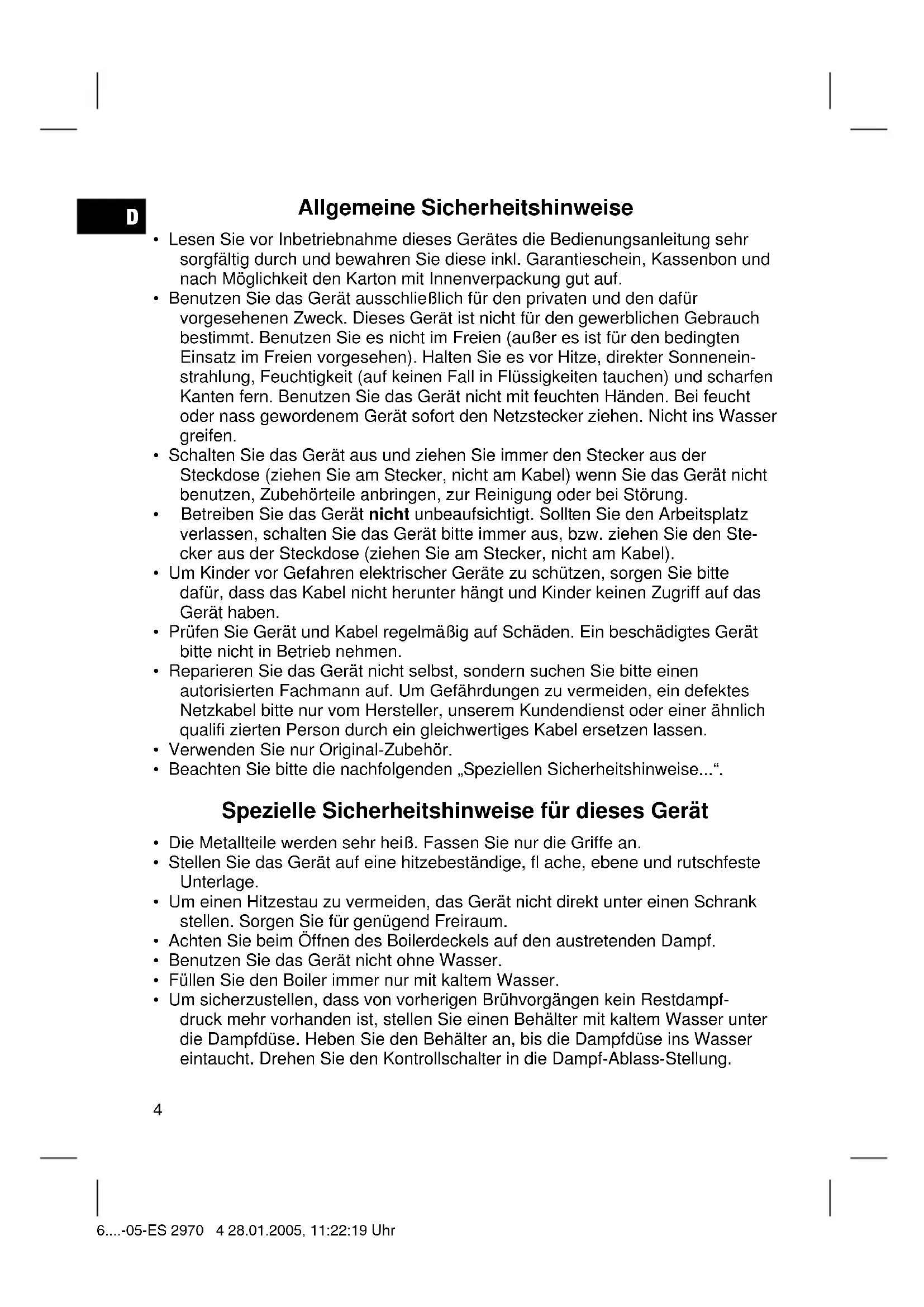 - Um sicherzustellen, dass von vorherigen Brühvorgängen kein Restdampf- druck mehr vorhanden ist, stellen Sie einen Behälter mit kaltem Wasser unter die Dampfdüse. Heben Sie den Behälter an, bis die Dampfdüse ins Wasser eintaucht. Drehen Sie den Kontrollschalter in die Dampf-Ablass-Stellung. 6....-05-ES 2970 4 28.01.2005, 11:22:19 UhrD