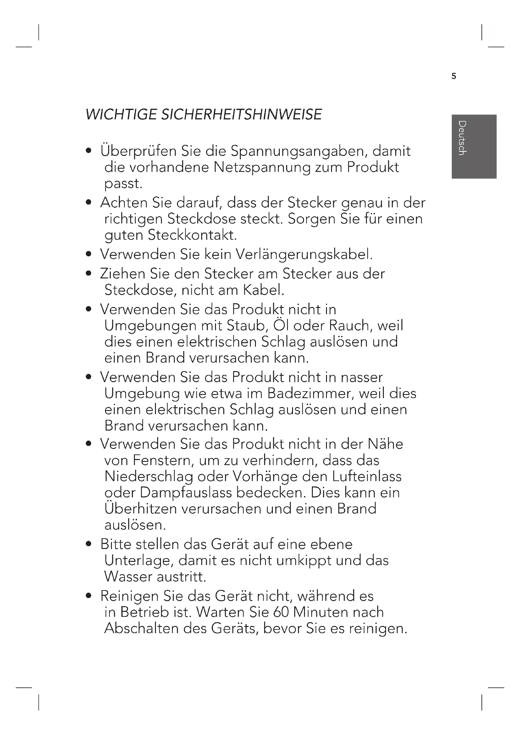- Reinigen Sie das Gerät nicht, während es in Betrieb ist. Warten Sie 60 Minuten nach Abschalten des Geräts, bevor Sie es reinigen.6 Deutsch Deutsch