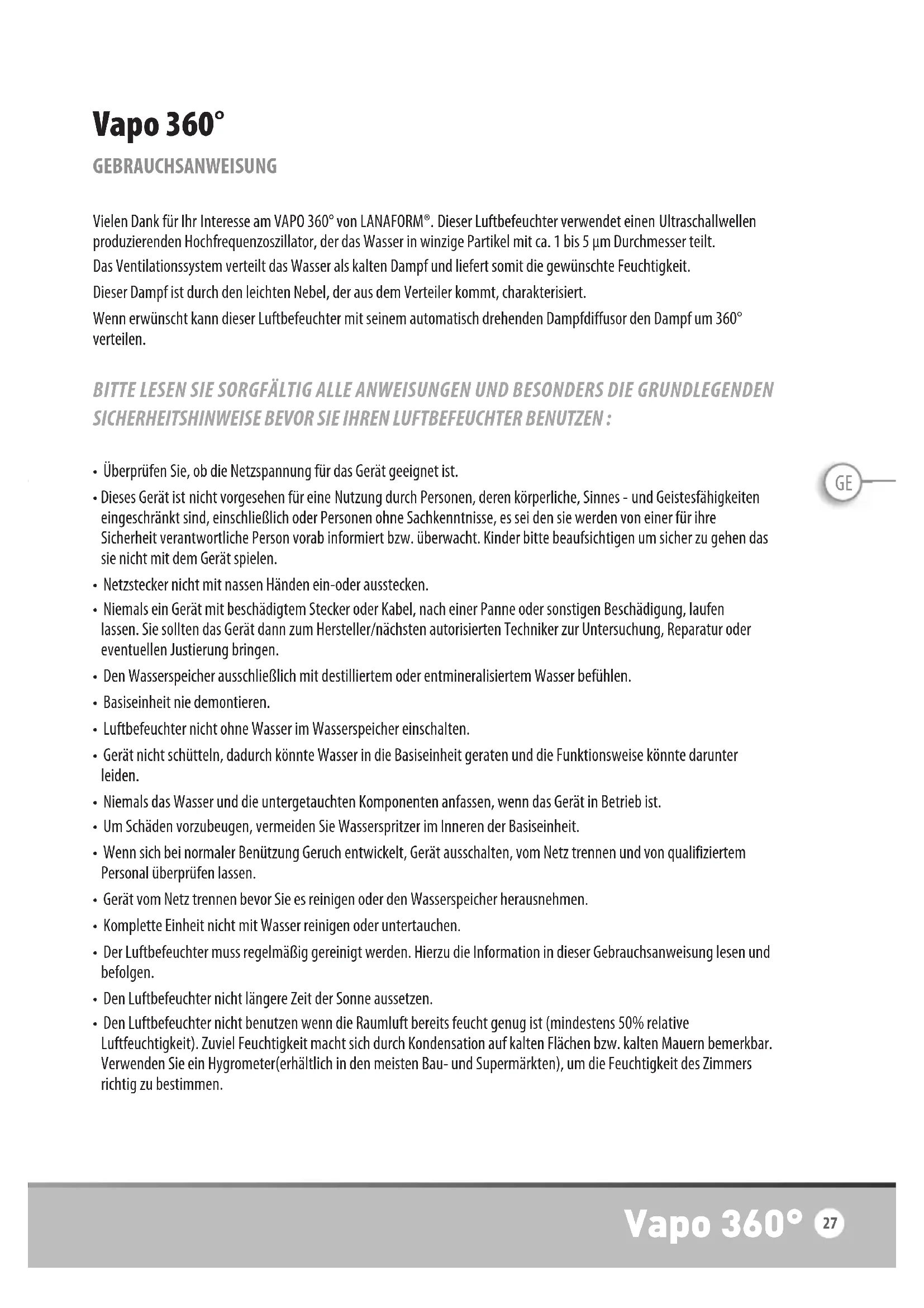Vapo 360° GEBRAUCHSANWEISUNG Vielen Dank für Ihr Interesse am VAPO 360° von LANAFORM®. Dieser Luftbefeuchter verwendet einen Ultraschallwellen produzierenden Hochfrequenzoszillator, der das Wasser in winzige Partikel mit ca. 1 bis 5 μm Durchmesser teilt. Das Ventilationssystem verteilt das Wasser als kalten Dampf und liefert somit die gewünschte Feuchtigkeit. Dieser Dampf ist durch den leichten Nebel, der aus dem Verteiler kommt, charakterisiert. Wenn erwünscht kann dieser Luftbefeuchter mit seinem automatisch drehenden Dampfdiffusor den Dampf um 360° verteilen. BITTE LESEN SIE SORGFÄLTIG ALLE ANWEISUNGEN UND BESONDERS DIE GRUNDLEGENDEN SICHERHEITSHINWEISE BEVOR SIE IHREN LUFTBEFEUCHTER BENUTZEN :