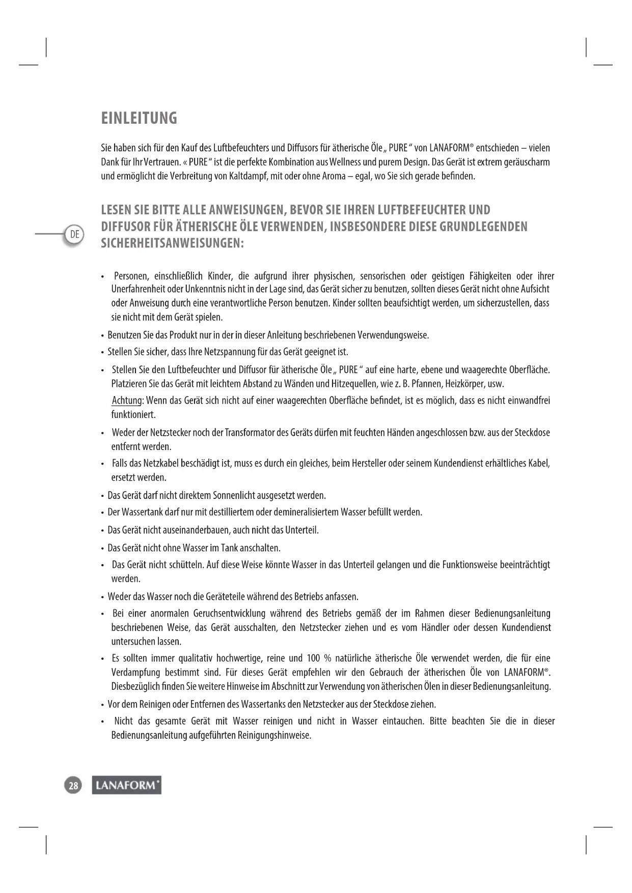 EINLEITUNG Sie haben sich für den Kauf des Luftbefeuchters und Diusors für ätherische Öle „ PURE “ von LANAFORM® entschieden – vielen Dank für Ihr Vertrauen. « PURE “ ist die perfekte Kombination aus Wellness und purem Design. Das Gerät ist extrem geräuscharm und ermöglicht die Verbreitung von Kaltdampf, mit oder ohne Aroma – egal, wo Sie sich gerade benden. LESEN SIE BITTE ALLE ANWEISUNGEN, BEVOR SIE IHREN LUFTBEFEUCHTER UND DIFFUSOR FÜR ÄTHERISCHE ÖLE VERWENDEN, INSBESONDERE DIESE GRUNDLEGENDEN SICHERHEITSANWEISUNGEN:
