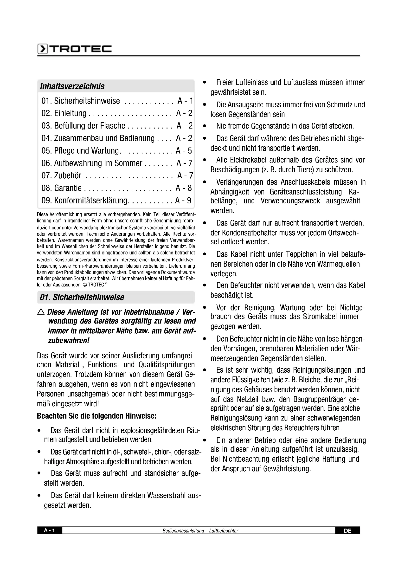 Diese Veröffentlichung ersetzt alle vorhergehenden. Kein Teil dieser Veröffent- lichung darf in irgendeiner Form ohne unsere schriftliche Genehmigung repro- duziert oder unter Verwendung elektronischer Systeme verarbeitet, vervielfältigt oder verbreitet werden. Technische Änderungen vorbehalten. Alle Rechte vor- behalten. Warennamen werden ohne Gewährleistung der freien Verwendbar- keit und im Wesentlichen der Schreibweise der Hersteller folgend benutzt. Die verwendeten Warennamen sind eingetragene und sollten als solche betrachtet werden. Konstruktionsveränderungen im Interesse einer laufenden Produktver- besserung sowie Form-/Farbveränderungen bleiben vorbehalten. Lieferumfang kann von den Produktabbildungen abweichen. Das vorliegende Dokument wurde mit der gebotenen Sorgfalt erarbeitet. Wir übernehmen keinerlei Haftung für Feh- ler oder Auslassungen. © TROTEC