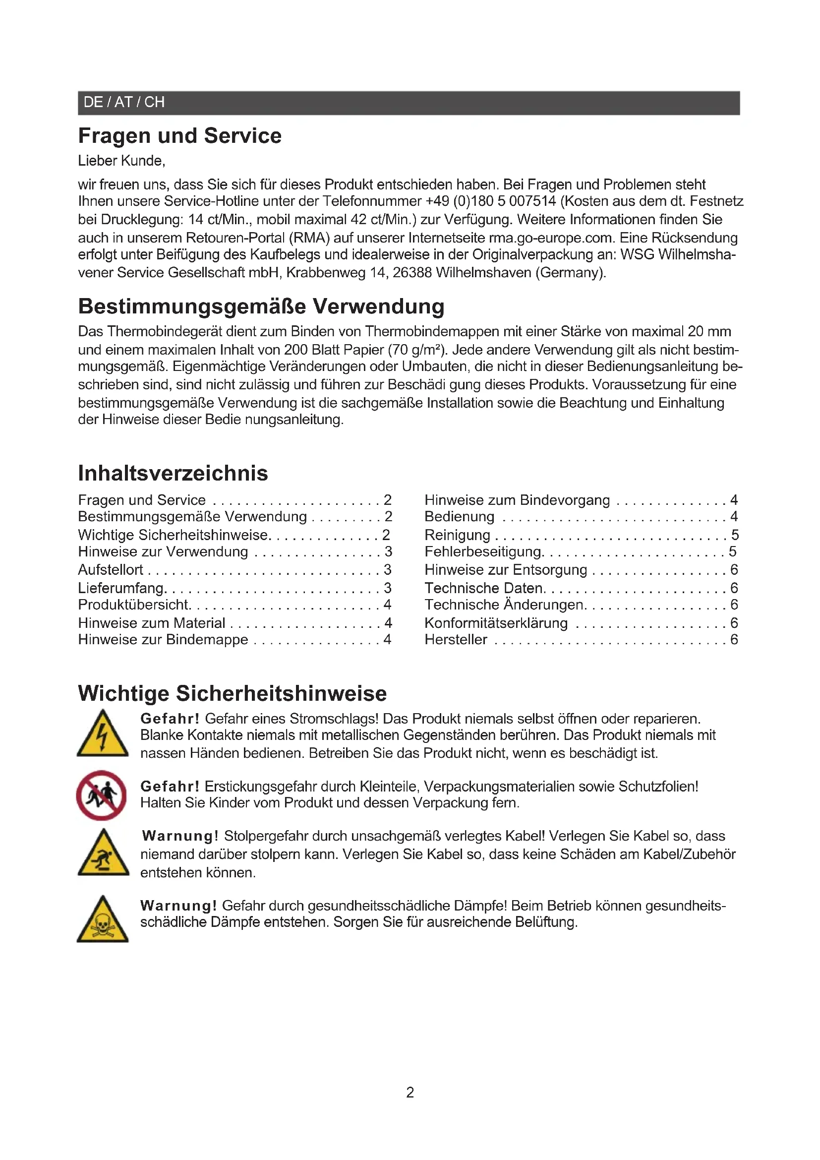 - DE Thermobindegerät EN Thermal Binder FR Thermorelieur IT Termoliegatrice NL Thermisch inbindapparaat ES Encuadernadora térmica PT Encadernar CZ Vázání PL Termobinder HR Uređaj za toplinsko vezivanje GR Θερμοκολλητική μηχανή TR Sıcak mühürleme makinesi AR يرارحلا متخلا ةلآ TB 1280 GO Europe GmbH Zum Kraftwerk 1 45527 Hattingen Germany www.go-europe.com V 1.16 09/2025 ID: 30422 DE / AT / CH Fragen und Service Lieber Kunde, wir freuen uns, dass Sie sich für dieses Produkt entschieden haben. Bei Fragen und Problemen steht Ihnen unsere Service-Hotline unter der Telefonnummer +49 (0)180 5 007514 (Kosten aus dem dt. Festnetz bei Drucklegung: 14 ct/Min., mobil maximal 42 ct/Min.) zur Verfügung. Weitere Informationen nden Sie auch in unserem Retouren-Portal (RMA) auf unserer Internetseite rma.go-europe.com. Eine Rücksendung erfolgt unter Beifügung des Kaufbelegs und idealerweise in der Originalverpackung an: WSG Wilhelmsha- vener Service Gesellschaft mbH, Krabbenweg 14, 26388 Wilhelmshaven (Germany). Bestimmungsgemäße Verwendung Das Thermobindegerät dient zum Binden von Thermobindemappen mit einer Stärke von maximal 20 mm und einem maximalen Inhalt von 200 Blatt Papier (70 g/m²). Jede andere Verwendung gilt als nicht bestim- mungsgemäß. Eigenmächtige Ver änderungen oder Umbauten, die nicht in dieser Bedienungsanlei tung be- schrieben sind, sind nicht zulässig und führen zur Beschädi gung dieses Produkts. Voraussetzung für eine bestimmungsgemäße Verwendung ist die sachgemäße Installation sowie die Beachtung und Einhaltung der Hinweise dieser Bedie nungsanleitung. Inhaltsverzeichnis Fragen und Service p. 2