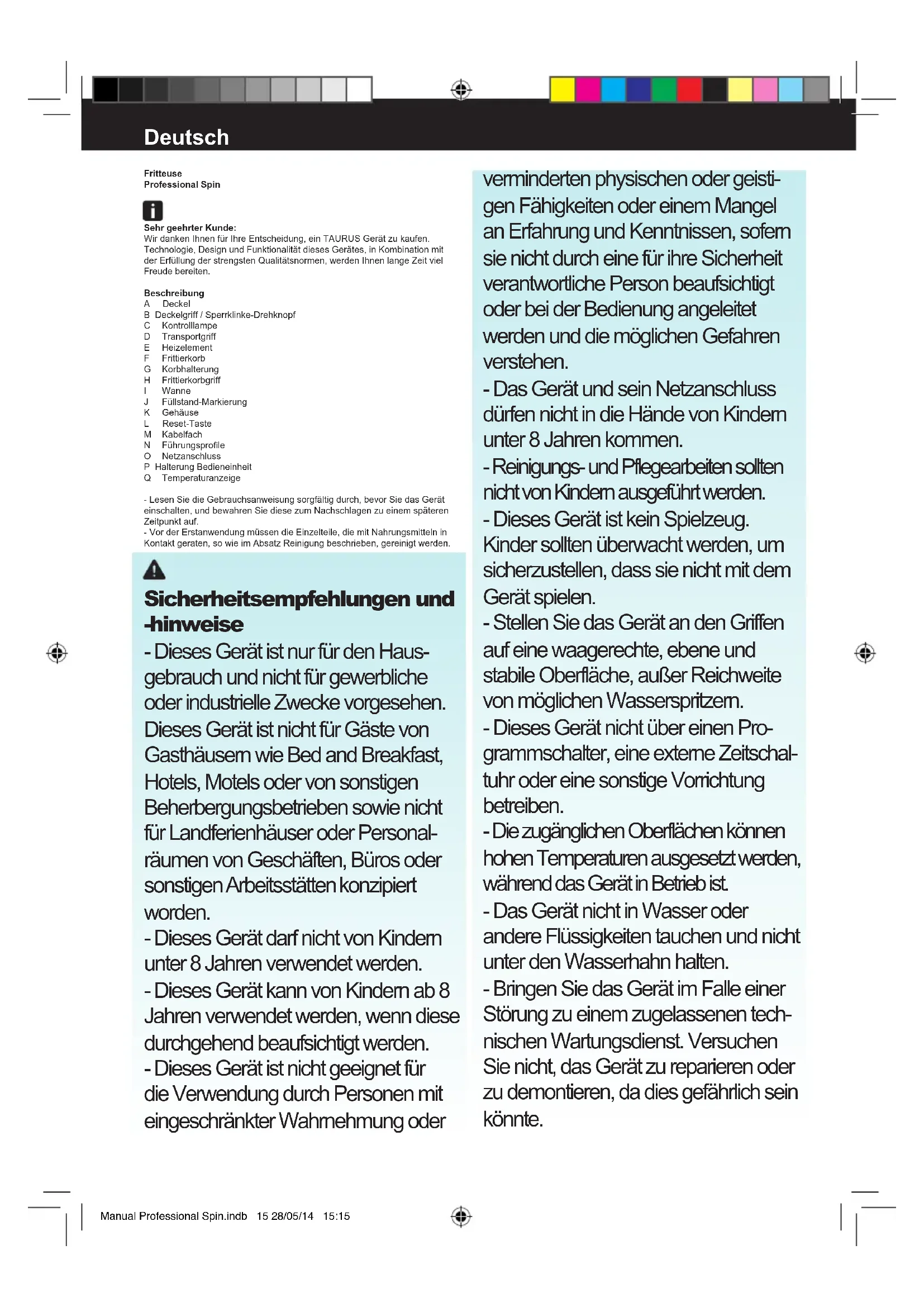 train de tourner. Veiller à retirer soigneusement le couvercle pour éviter le contact accidentel avec des éventuelles traces d’huile chaude subsistante à l’intérieur. Lorsque vous avez ni de vous servir de l’appareil: - Mettre le thermostat sur la position minimum (MIN). - Débrancher l’appareil du secteur. - Ranger le câble dans le logement prévu à cet effet. - Mettre le panier dans la cuve. -Lapoignéedupanierpeutêtrelaisséexeoupeutserepliersurlepanieren appuyant sur la barre vers le côté et en la tournant. - Placer le couvercle Compartiment câble - Cet appareil dispose d’un ramasse cordon situé dans la partie inférieure de l’appareil. Poignée de Transport: - Cet appareil dispose d’une poignée sur sa partie latérale pour faciliter son transport en toute commodité. Conseils pratiques: - Pour désodoriser l’huile, il est possible de faire frire des morceaux de pain. - Il vaut mieux faire frire en deux fois les aliments qui contiennent beaucoup d’eau: le résultat est plus économique et plus rapide. Ce système consiste à réaliser une première friture jusqu’à ce que les aliments soient cuits et ensuite une autre pour les faire dorer, ceci à l’huile très chaude. - Il est conseillé d’utiliser une huile d’olive faiblement acide. - Ne pas mélanger des huiles de qualités différentes. - Pour éviter que les pommes de terre ne collent, il est recommandé de les laver avant de les frire. Protecteur thermique de sûreté: - L’appareil dispose d’un dispositif thermique de sûreté qui protège l’appareil de toute surchauffe. - En cas de surchauffe, un dispositif de sécurité thermique se déclenchera et l’appareil s’arrêtera automatiquement. Dans ce cas, vous devrez débrancher l’appareil du réseau électrique et le laisser refroidir. Ci-après, appuyer sur le bouton réarmement situé sur la partie postérieure de l’ensemble électrique, avec la pointe d’un stylo ou similaire pour que l’appareil puisse se remettre à fonctionner normalement (Fig.5). Manual Professional Spin.indb 13 28/05/14 15:15Nettoyage - Débrancher l’appareil du secteur et attendre son complet refroidissement avant de la nettoyer. - Démonter l’appareil en suivant les pas décrits ci-dessous : Enlever le couvercle Sortir le panier et extraire le dispositif électrique. Retirer la cuve. Verser doucement l’huile usagée de la cuve dans un récipient (et pas dans l’évier), selon la réglementation en vigueur de traitement et d’élimination des déchets. Tourner le corps de la friteuse, puis démonter la connexion au courant de la base, en appuyant sur le clip et en tirant vers l’extérieur. Extraire le câble d’alimentation de son logement, puis séparer tout l’ensemble de la friteuse. Àl’exceptiondel’ensembleélectriqueetdelaconnexionauréseau,toutes les autres pièces peuvent se laver au détergent et à l’eau ou dans le lave- vaisselle. - Nettoyer l’appareil électrique et son cordon d’alimentation avec un chiffon humide et bien les sécher ensuite. NE JAMAIS IMMERGER l’APPAREIL NI LE CORDON DANS L’EAU NI AUCUN AUTRE LIQUIDE. - Nettoyer le dispositif électrique avec un chiffon humide et le laisser sécher. - Ne pas utiliser de solvants ni de produits à pH acide ou basique tels que l’eau de javel, ni de produits abrasifs pour nettoyer l’appareil. - Il est recommandé de nettoyer l’appareil régulièrement et de retirer tous les restes d’aliments. Les pièces ci-dessous peuvent se laver à l’eau chaude savonneuse ou au lave-vaisselle (en mode délicat) : - Panier - Cuve - Séchez l’article immédiatement après toute opération de nettoyage en vous assurant que la base du connecteur du produit est parfaitement sèche. - Bien sécher toutes les pièces avant de remonter et de garder l’appareil. Anomalies et réparation - En cas de panne, remettre l’appareil à un service d’assistance technique autorisé. Ne pas tenter de procéder aux réparations ou de démonter l’appareil; cela implique des risques. Pour les produits de l’Union Européenne et (ou) conformément à la réglemen- tation en vigueur de votre pays d’origine : Écologie et recyclage du produit - Les matériaux dont l’emballage de cet appareil est constitué intègrent un programmedecollecte,declassicationetderecyclage.Sivoussouhaitez vous en défaire, veuillez utiliser les conteneurs publics appropriés pour chaque type de matériel. - Le produit ne contient pas de concentrations de substances considérées comme étant nocives pour l’environnement. Cesymbolesigniequesivoussouhaitezvousdéfaireduproduit, une fois que celui-ci n’est plus utilisable, remettez-le, suivant la méthode appropriée, à un gestionnaire de déchets d’équipements électriques et électroniques (DEEE). CetappareilestcertiéconformeàlaDirective2006/95/ECdeBasseTension, de même qu’à la Directive 2004/108/EC en matière de Compatibilité Électro- magnétique, à la Directive 2011/65/EC relative à la limitation de l’utilisation de certaines substances dangereuses dans les équipements électriques et électroniques et à la Directive 2009/125/EC sur les conditions de conception écologique applicable aux produits en rapport avec l’énergie. Manual Professional Spin.indb 14 28/05/14 15:15Fritteuse Professional Spin Sehr geehrter Kunde: Wir danken Ihnen für Ihre Entscheidung, ein TAURUS Gerät zu kaufen. Technologie, Design und Funktionalität dieses Gerätes, in Kombination mit der Erfüllung der strengsten Qualitätsnormen, werden Ihnen lange Zeit viel Freude bereiten. Beschreibung A Deckel B Deckelgriff / Sperrklinke-Drehknopf C Kontrolllampe D Transportgriff E Heizelement F Frittierkorb G Korbhalterung H Frittierkorbgriff I Wanne J Füllstand-Markierung K Gehäuse L Reset-Taste M Kabelfach N Führungsprole O Netzanschluss P Halterung Bedieneinheit Q Temperaturanzeige - Lesen Sie die Gebrauchsanweisung sorgfältig durch, bevor Sie das Gerät e