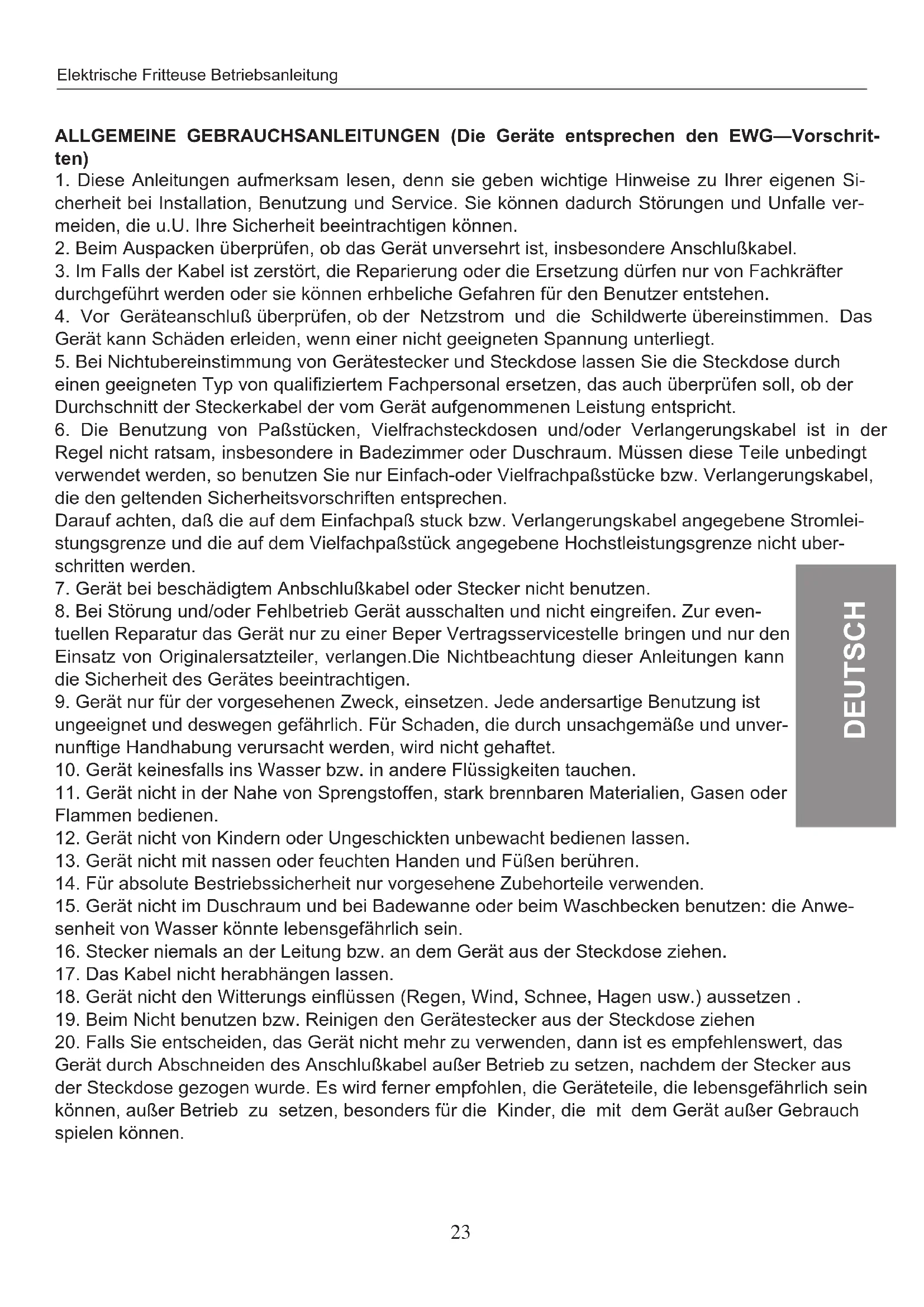 19. Fritiergerät außer Reichweite von Kindern halten, besonderss während des Fritiervorganges.