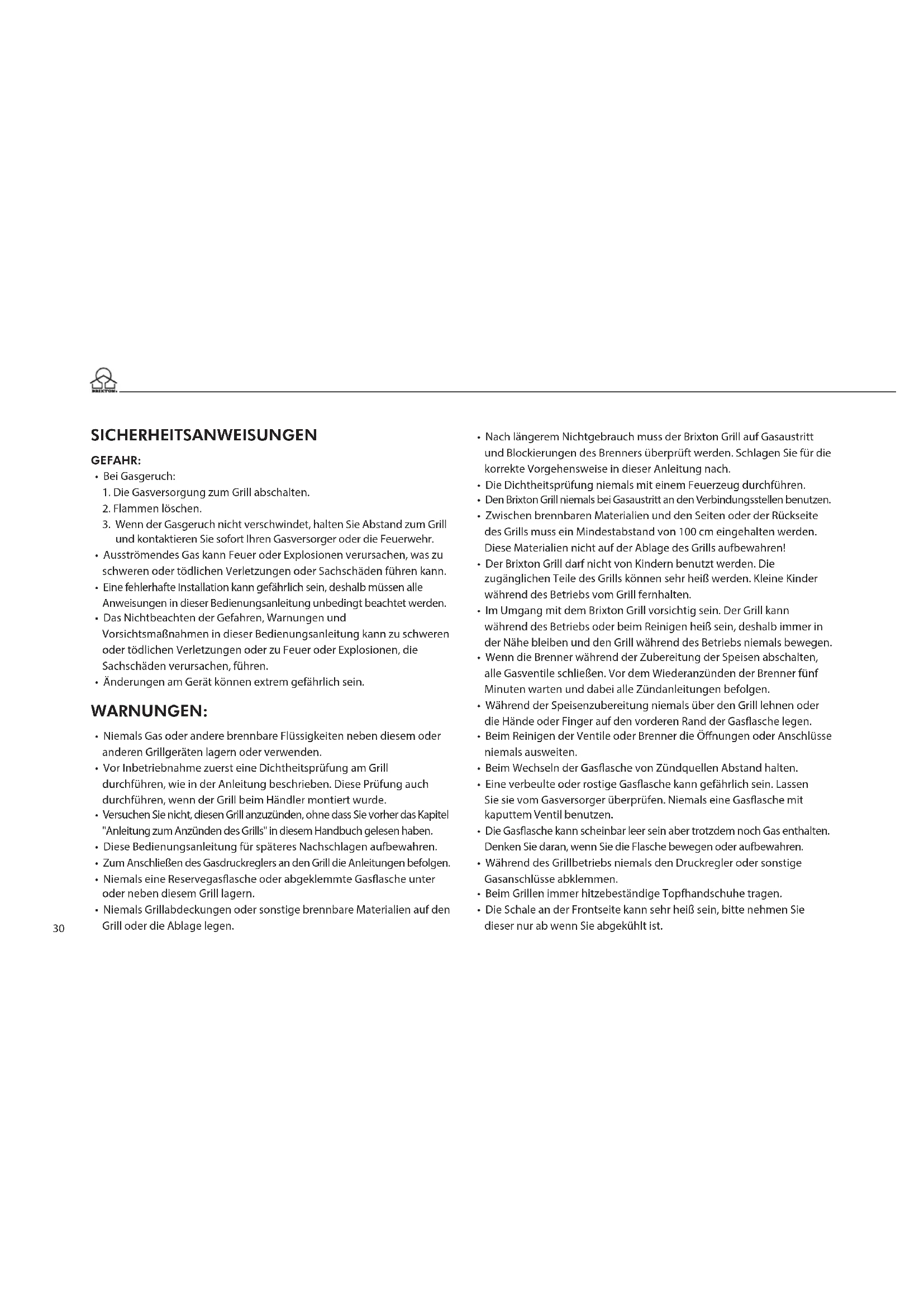 - Den Brixton Grill niemals bei Gasaustritt an den Verbindungsstellen benutzen.