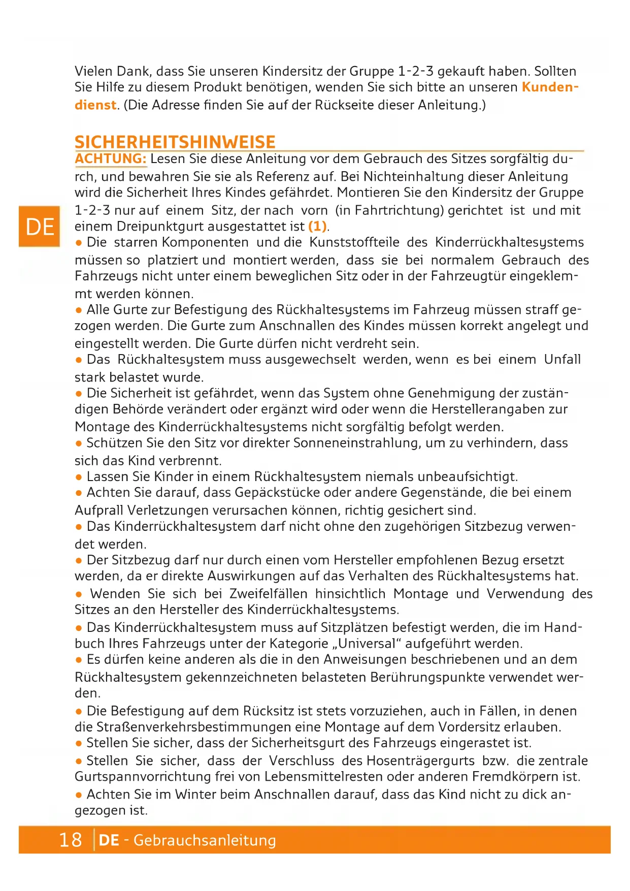 Vielen Dank, dass Sie unseren Kindersitz der Gruppe 1-2-3 gekauft haben. Sollten Sie Hilfe zu diesem Produkt benötigen, wenden Sie sich bitte an unseren Kunden- dienst. (Die Adresse finden Sie auf der Rückseite dieser Anleitung.) SICHERHEITSHINWEISE ACHTUNG: Lesen Sie diese Anleitung vor dem Gebrauch des Sitzes sorgfältig du- rch, und bewahren Sie sie als Referenz auf. Bei Nichteinhaltung dieser Anleitung wird die Sicherheit Ihres Kindes gefährdet. Montieren Sie den Kindersitz der Gruppe 1-2-3 nur auf einem Sitz, der nach vorn (in Fahrtrichtung) gerichtet ist und mit einem Dreipunktgurt ausgestattet ist (1).