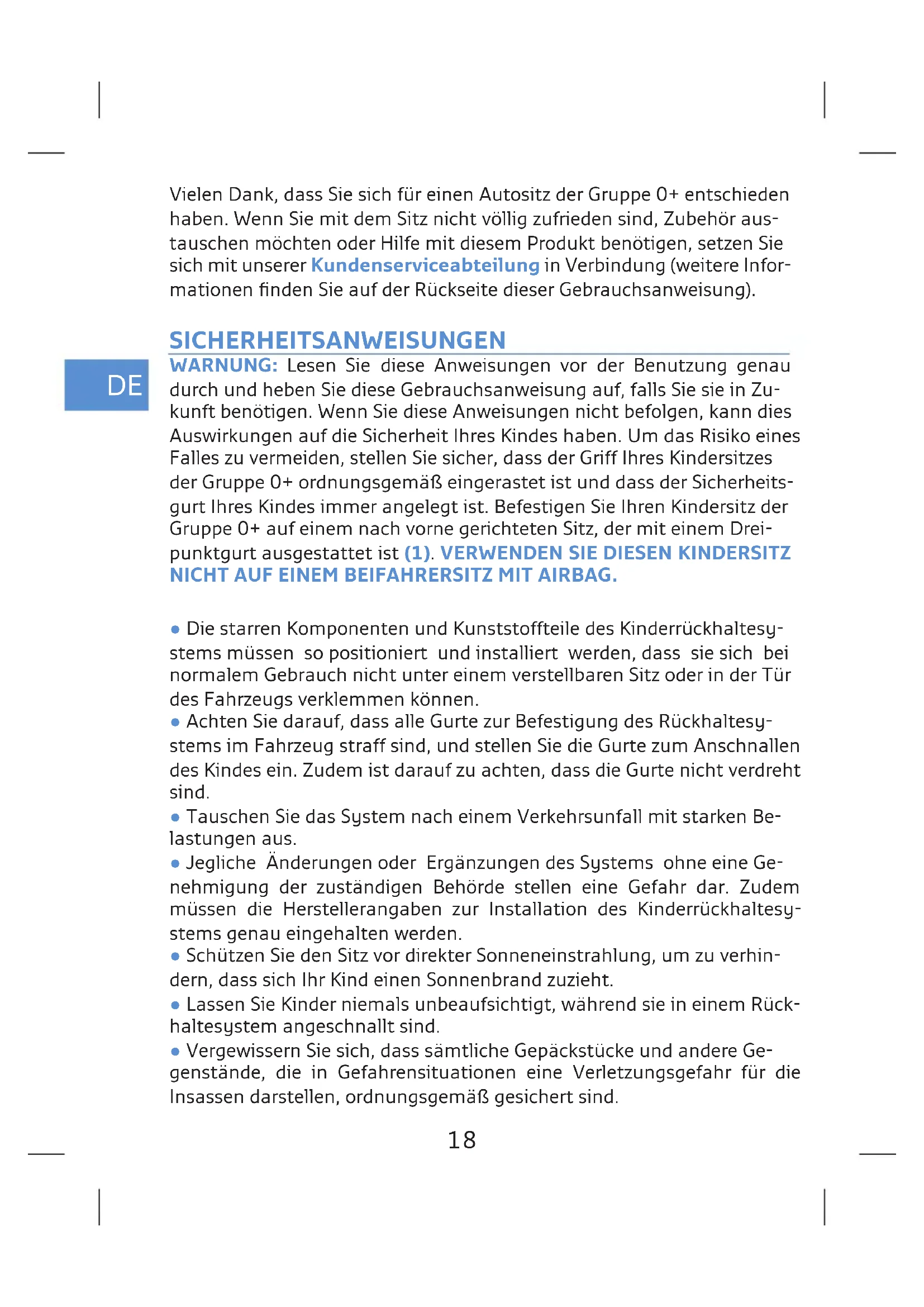 Vielen Dank, dass Sie sich für einen Autositz der Gruppe 0+ entschieden haben. Wenn Sie mit dem Sitz nicht völlig zufrieden sind, Zubehör aus- tauschen möchten oder Hilfe mit diesem Produkt benötigen, setzen Sie sich mit unserer Kundenserviceabteilung in Verbindung (weitere Infor- mationen finden Sie auf der Rückseite dieser Gebrauchsanweisung). SICHERHEITSANWEISUNGEN WARNUNG: Lesen Sie diese Anweisungen vor der Benutzung genau durch und heben Sie diese Gebrauchsanweisung auf, falls Sie sie in Zu- kunft benötigen. Wenn Sie diese Anweisungen nicht befolgen, kann dies Auswirkungen auf die Sicherheit Ihres Kindes haben. Um das Risiko eines Falles zu vermeiden, stellen Sie sicher, dass der Griff Ihres Kindersitzes der Gruppe 0+ ordnungsgemäß eingerastet ist und dass der Sicherheits- gurt Ihres Kindes immer angelegt ist. Befestigen Sie Ihren Kindersitz der Gruppe 0+ auf einem nach vorne gerichteten Sitz, der mit einem Drei- punktgurt ausgestattet ist (1). VERWENDEN SIE DIESEN KINDERSITZ NICHT AUF EINEM BEIFAHRERSITZ MIT AIRBAG.