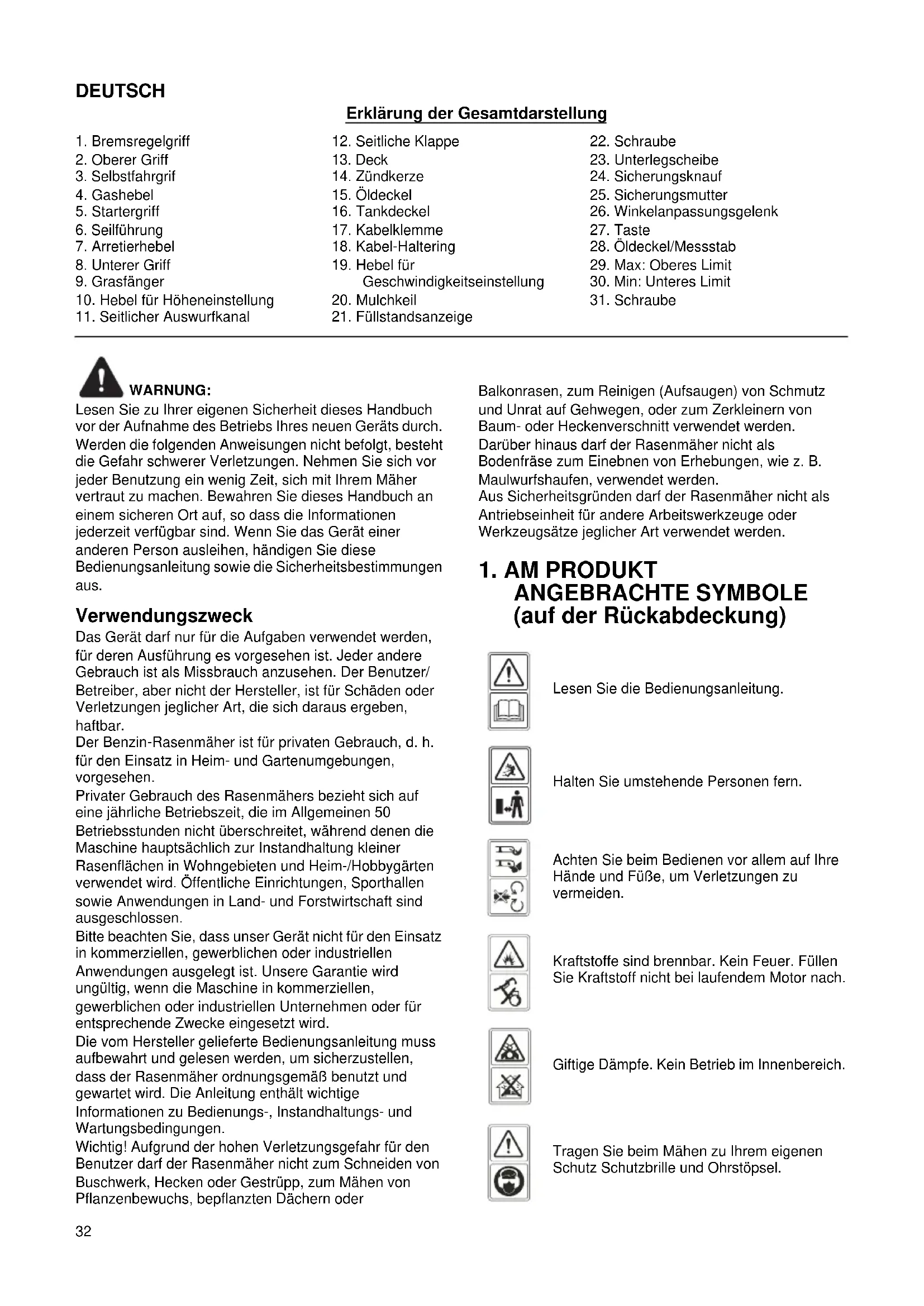 Lesen Sie die Bedienungsanleitung. Halten Sie umstehende Personen fern. Achten Sie beim Bedienen vor allem auf Ihre Hände und Füße, um Verletzungen zu vermeiden. Kraftstoffe sind brennbar. Kein Feuer. Füllen Sie Kraftstoff nicht bei laufendem Motor nach. Giftige Dämpfe. Kein Betrieb im Innenbereich. Tragen Sie beim Mähen zu Ihrem eigenen Schutz Schutzbrille und Ohrstöpsel.33