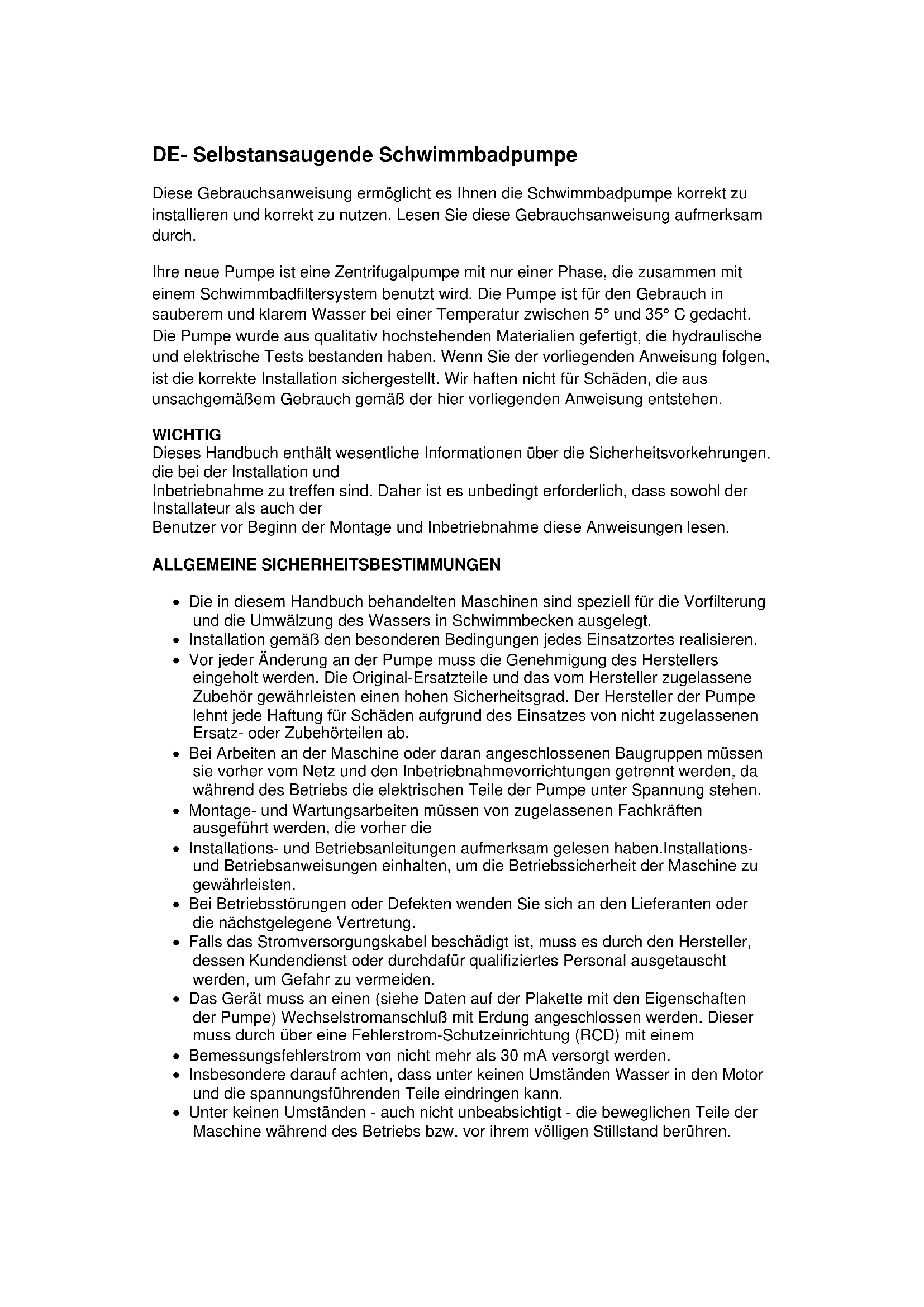 Inbetriebsetzung der Pumpe Pumpe nur anschalten, wenn der An- und Absaugschlauch korrekt am Eingang und Ausgang der Pumpe angebracht sind. Überprüfen Sie, dass die Schläuche nicht verstopft sind. Wartung und Reinigung Ihre neue Pumpe benötigt keine spezifische Wartung und Reinigung. Falls die Pumpe längere Zeit nicht benutzt wird, sollten Sie sie abbauen und an einem trockenen und gut gelüfteten Ort aufbewahren. Wenn das Stromkabel beschädigt ist, müssen Sie es durch den Fabrikanten oder einen Vertreter oder eine andere qualifizierte Fachperson ersetzen lassen, um Gefahren zu vermeiden. Reinigen Sie Ihre Pumpe regelmäßig, damit der Ansaugschlauch nicht verstopft und die Pumpe beschädigt wird. Die Bauteile der Pumpe mit normalem Verschleiß bzw. Abnutzung müssen regelmäßig ersetzt werden, damit dieLeistungsfähigkeit der Pumpe nicht beeinträchtigt wird Regelmäßig kontrollieren: o die korrekte Befestigung der mechanischen Teile und den Zustand der Befestigungsschrauben der Maschine. o die korrekte Position, Befestigung und den Zustand der Netzkabel und Isolierungen. o die Temperatur der Maschine und des Elektromotors. Bei Störungen die Maschine sofort ausschalten und wenden Sie sich bitte an die nächste Kundendienst. o Vibrationen an der Maschine. Bei Störungen die Maschine sofort ausschalten und wenden Sie sich bitte an die nächste Kundendienst.Problem Grund Lösung Die Pumpe funktioniert nicht. Kein Strom Benutzen Sie ein anderes Gerät und überprüfen Sie so die Steckdose. Überprüfen Sie die Sicherungen. Die Sicherung ist durchgebrannt. Überprüfen Sie die Sicherung und ersetzen Sie sie falls nötig. DieÜberhitzungsautomatik der Pumpe hat sie zum Schutz ausgeschaltet. Pumpe vom Strom nehmen und den Motor abkühlen lasse, ehe Sie die Pump erneut in Betrieb setzen. Stellen Sie sicher, dass die Pumpe und der Motor genügend belüftet werden. Stellen Sie sicher, dass die Pumpe nicht verschmutzt ist und der Motor frei dreht. Der Motor ist aufgrund von Überspannung oder Wasser verbrannt. Eventuell müssen Sie den Motor ersetzen. Die Pumpe funktioniert mit einer verringerten Austoßmenge oder ohne Austoß. Die Pumpe ist verstopft (stellen Sie sicher, dass der Motor frei dreht) Pumpe oder Korb verstopft. Ventile sind geschlossen. Überprüfen Sie das System und stellen Sie sicher, dass die Ventile offen sind, darunter insbesondere die Pumpeingangs- und - ausgangsventile. Der Filter ist verschmutzt. Filter reinigen Luft im System. Pumpe anstellen (s. Inbetriebnahme). Überprüfen Sie, ob es Luftlecke im Ansaugrohr oder an den Anschlüssen gibt. Stellen Sie sicher, dass der Korbdeckel gut geschlossen und dicht ist. Überprüfen Sie die Pumpe auf Lecks unten. Wassermangel. Stellen Sie sicher, dass der Wasserpegel des Schwimmbades mindestens bis zur Hälfte des Skimmers kommt. Pumpe oder Skimmer verstopft. (Hinweis: Pumpe nicht in Betrieb setzen, wenn Korb oder Skimmer nicht richtig angebracht sind.) Stellen Sie sicher, dass die Pumpe und der Skimmer nicht verschmutzt sind. Stellen Sie sicher, dass der Eingang und Ausgang der Pumpe nicht verstopft ist oder die Pumpe nicht blockiert wird.
