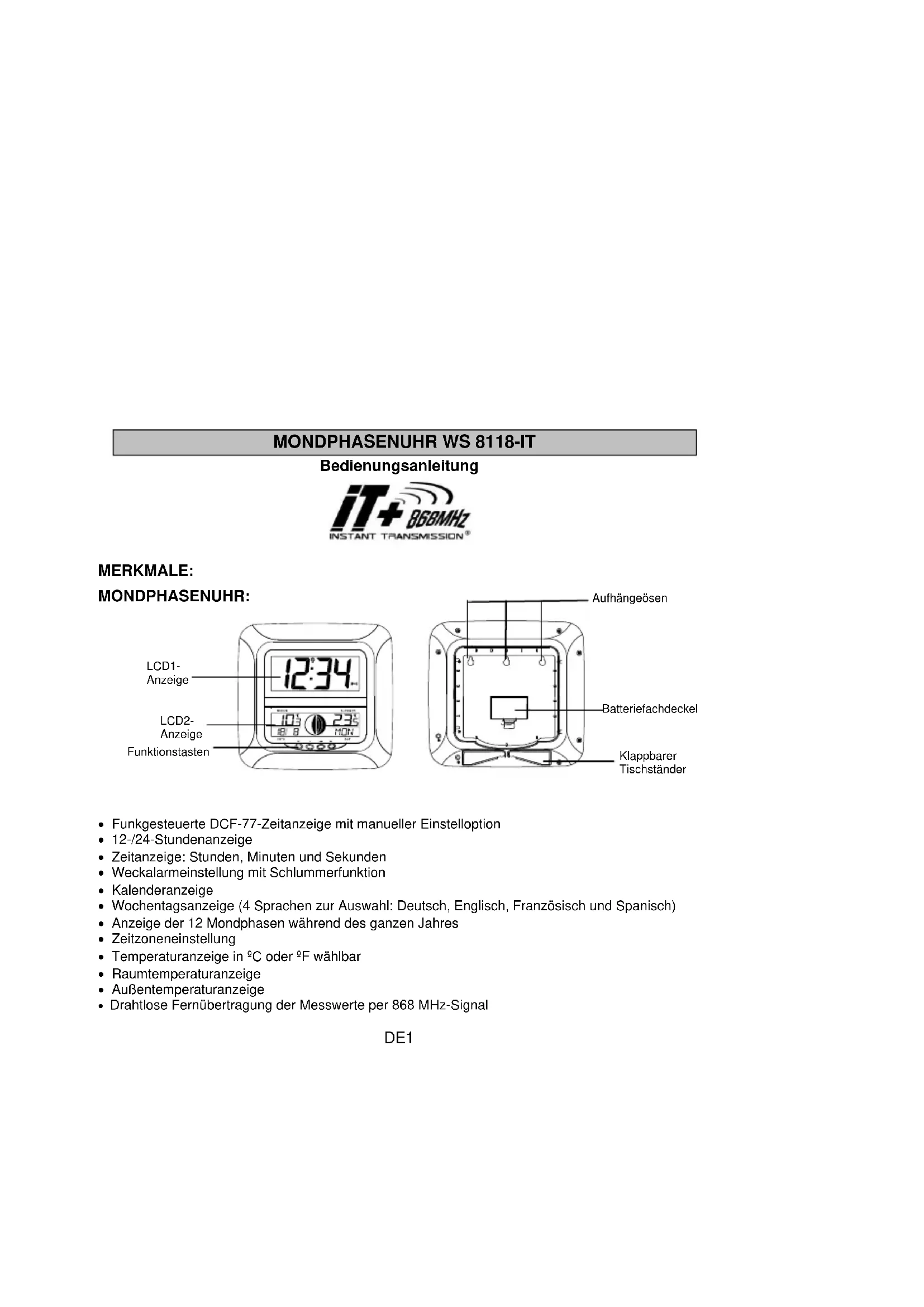 Laden Sie die Anleitung für Ihr Uhr kostenlos im PDF-Format! Finden Sie Ihr Handbuch WS 8118 - TECHNOLINE und nehmen Sie Ihr elektronisches Gerät wieder in die Hand. Auf dieser Seite sind alle Dokumente veröffentlicht, die für die Verwendung Ihres Geräts notwendig sind. WS 8118 von der Marke TECHNOLINE.