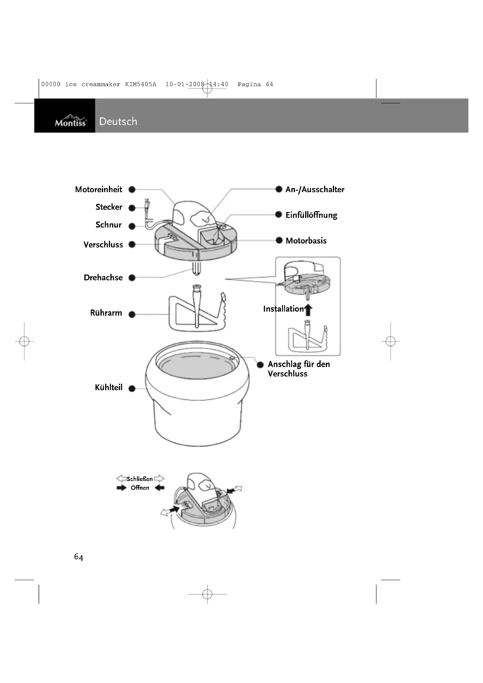English 00000 ice creammaker KIM5405A 10-01-2008 14:40 Pagina 6263 00000 ice creammaker KIM5405A 10-01-2008 14:40 Pagina 6364 Deutsch Motoreinheit Stecker Schnur Verschluss Drehachse An-/Ausschalter Einfüllöffnung Motorbasis Anschlag für den Verschluss Installation Rührarm Kühlteil Schließen Öffnen 00000 ice creammaker KIM5405A 10-01-2008 14:40 Pagina 64Gebrauch 1 Stellen Sie vor der Inbetriebnahme das Kühlteil mindestens 18 Stunden in den Gefrierschrank. Danach ist das Kühlteil bereit für den Gebrauch. Montieren Sie das Kühlteil in die Eismaschine. Achten Sie darauf, dass Sie das Kühlteil immer mit einem trockenen Tuch anfassen. Falls Ihre (nassen) Hände in Kontakt mit dem Kühlteil kommen, kann dies dazu führen, dass Ihre Hände am Kühlteil festkleben. Sollte dieser Fall eintreten, dann halten Sie Ihre Hände unter warmes Wasser.