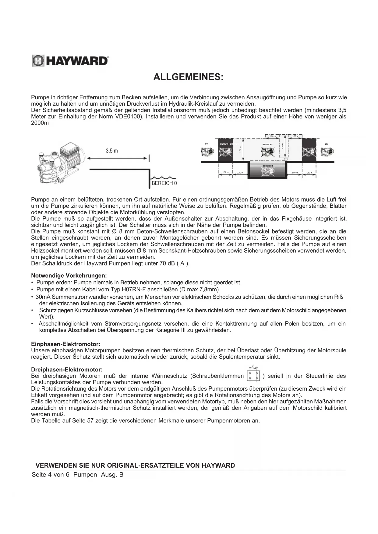 sobreaquecimento prolongado.HAYWARD POOL EUROPE - 1070 Allée des Chênes - CS 20054 Saint Vulbas - 01154 Lagnieu Cedex - France BEWAHREN SIE DIESES HANDBUCH FÜR EINE SPÄTERE EINSICHTNAHME AUF ZENTRIFUGALPUMPE ANWENDER - HANDBUCHVERWENDEN SIE NUR ORIGINAL-ERSATZTEILE VON HAYWARD Seite 2 von 6 Pumpen Ausg. B WARNUNG – Vor Öffnen des Deckels Pumpe komplett von der Hauptstromversorgung trennen. WARNUNG – Die elektrischen Anschlüsse sind von einem zugelassenen qualifizierten Elektriker nach den geltenden Normen im Land der Installation vorzunehmen:F NF C 15-100 GB BS7671:1992D DIN VDE 0100-702 EW EVHS-HD 384-7-702A ÖVE 8001-4-702 H MSZ 2364-702:1994 / MSZ 10-533 1/1990 E UNE 20460-7-702 1993, REBT ITC-BT-31 2002 M MSA HD 384-7-702.S2 IRL IS HD 384-7-702 PL PN-IEC 60364-7-702:1999