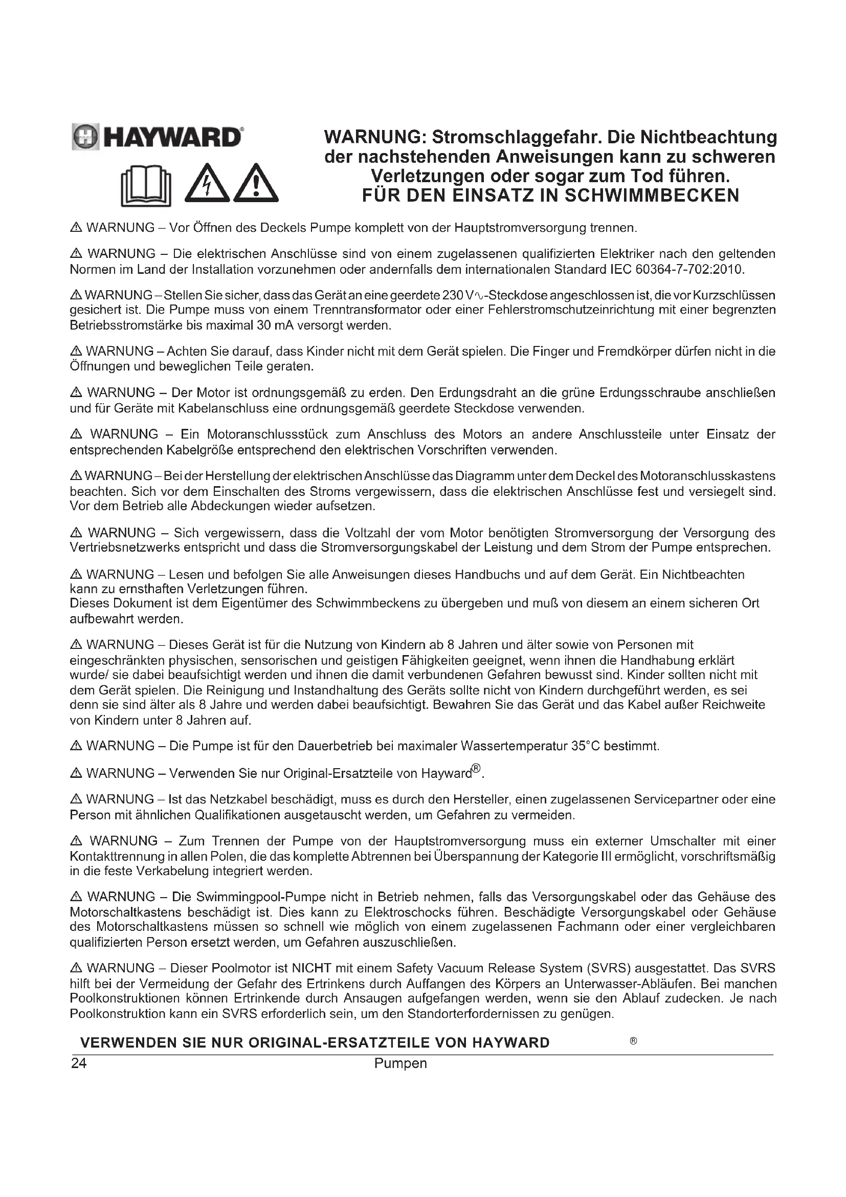 - WARNUNG – Dieser Poolmotor ist NICHT mit einem Safety Vacuum Release System (SVRS) ausgestattet. Das SVRS hilft bei der Vermeidung der Gefahr des Ertrinkens durch Auffangen des Körpers an Unterwasser-Abläufen. Bei manchen Poolkonstruktionen können Ertrinkende durch Ansaugen aufgefangen werden, wenn sie den Ablauf zudecken. Je nach Poolkonstruktion kann ein SVRS erforderlich sein, um den Standorterfordernissen zu genügen. WARNUNG: Stromschlaggefahr. Die Nichtbeachtung der nachstehenden Anweisungen kann zu schweren Verletzungen oder sogar zum Tod führen.