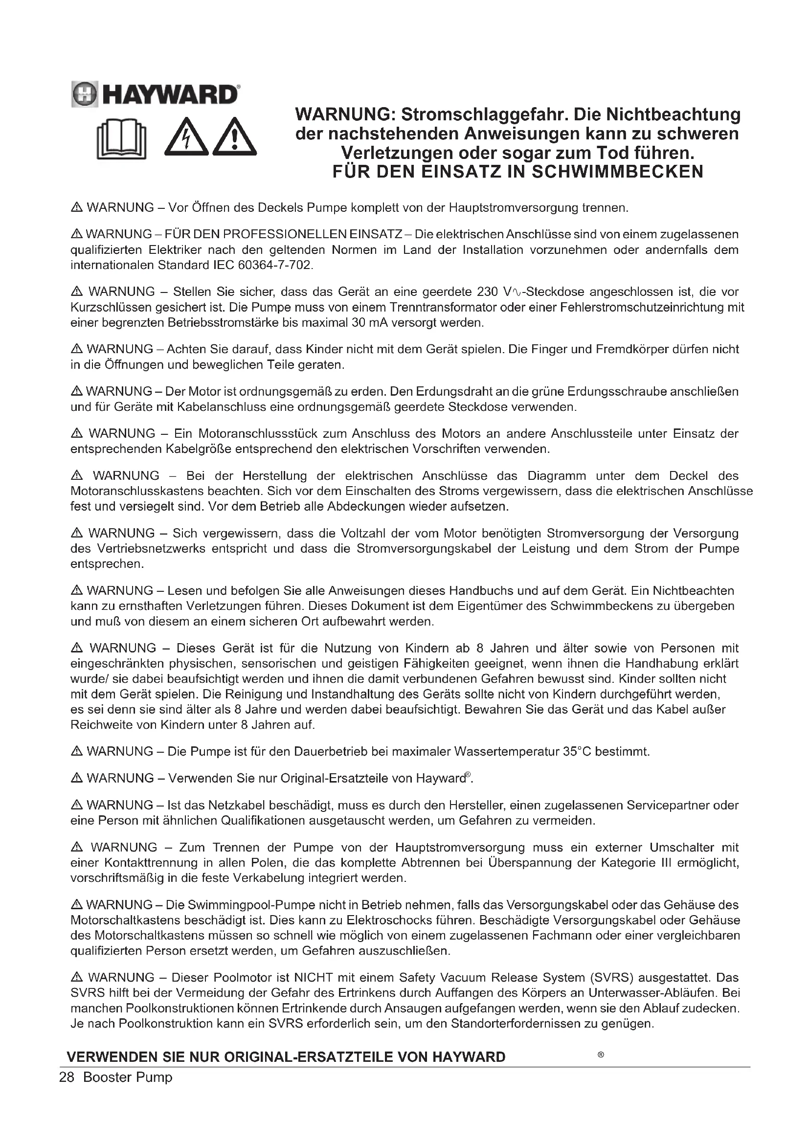 - WARNUNG – Dieser Poolmotor ist NICHT mit einem Safety Vacuum Release System (SVRS) ausgestattet. Das SVRS hilft bei der Vermeidung der Gefahr des Ertrinkens durch Auffangen des Körpers an Unterwasser-Abläufen. Bei manchen Poolkonstruktionen können Ertrinkende durch Ansaugen aufgefangen werden, wenn sie den Ablauf zudecken. Je nach Poolkonstruktion kann ein SVRS erforderlich sein, um den Standorterfordernissen zu genügen. WARNUNG: Stromschlaggefahr. Die Nichtbeachtung der nachstehenden Anweisungen kann zu schweren Verletzungen oder sogar zum Tod führen.