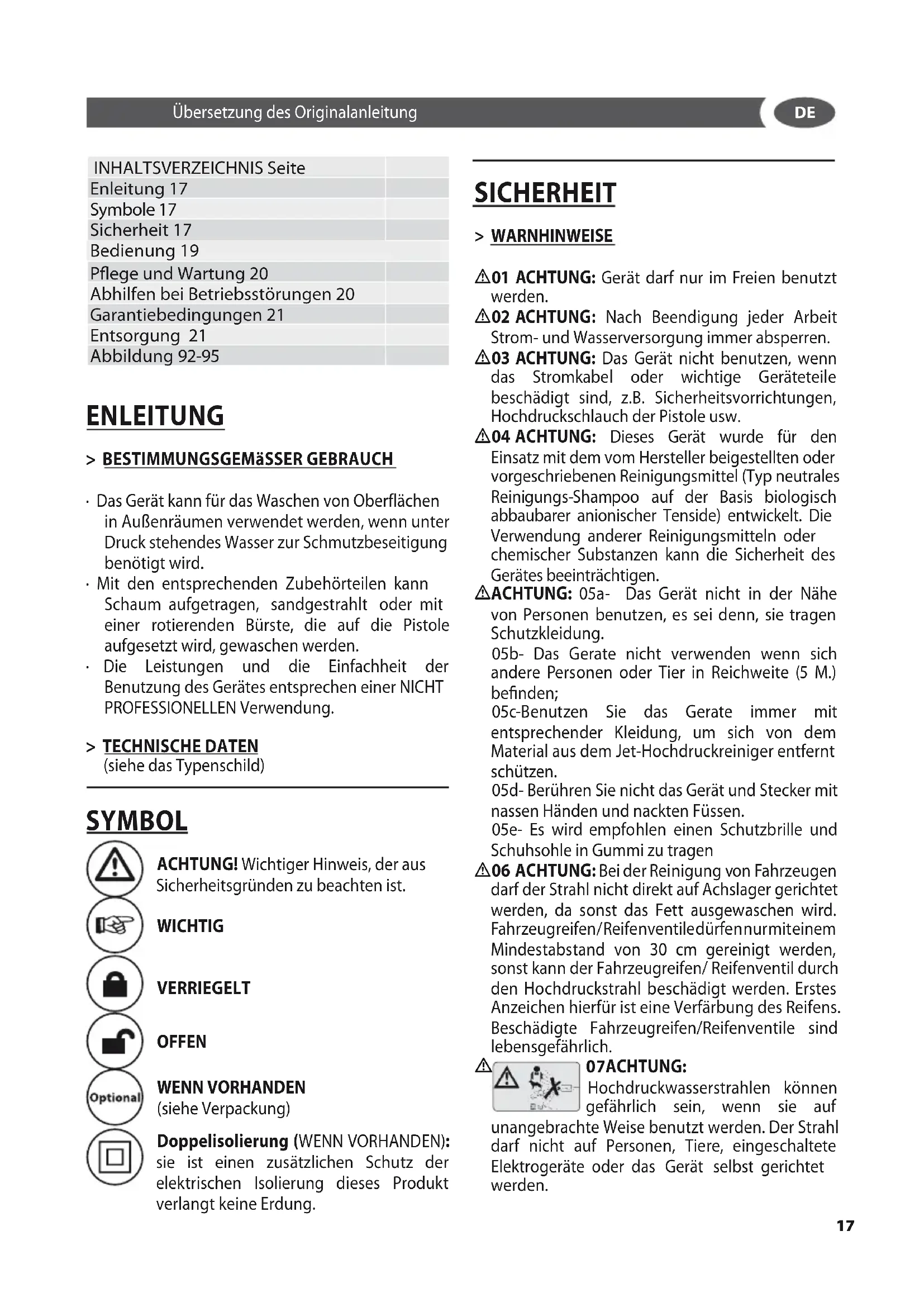 INHALTSVERZEICHNIS Seite Enleitung 17 Symbole 17 Sicherheit 17 Bedienung 19 Pege und Wartung 20 Abhilfen bei Betriebsstörungen 20 Garantiebedingungen 21 Entsorgung 21 Abbildung 92-95 ENLEITUNG > BESTIMMUNGSGEMäSSER GEBRAUCH