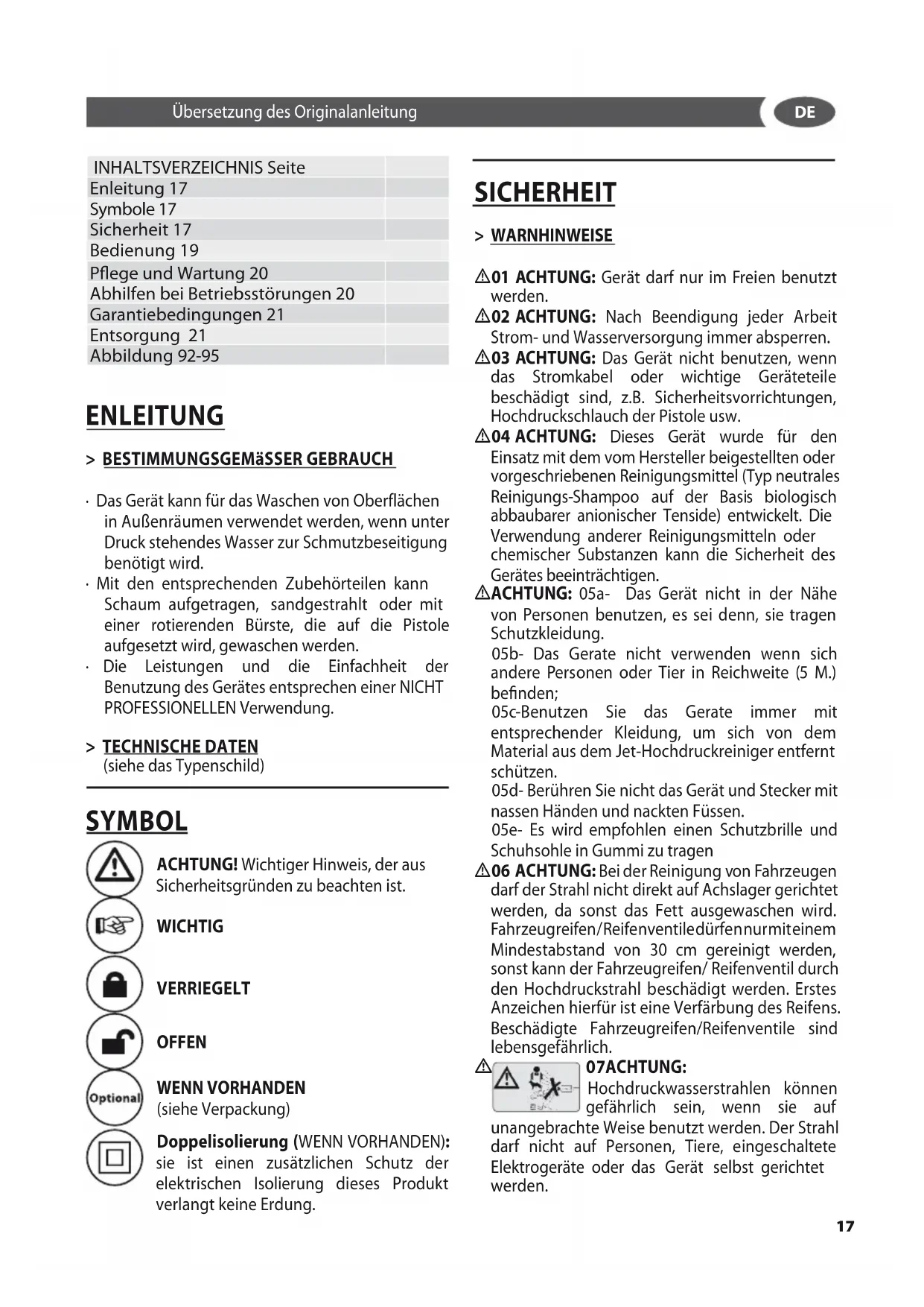 INHALTSVERZEICHNIS Seite Enleitung 17 Symbole 17 Sicherheit 17 Bedienung 19 Pege und Wartung 20 Abhilfen bei Betriebsstörungen 20 Garantiebedingungen 21 Entsorgung 21 Abbildung 92-95 ENLEITUNG > BESTIMMUNGSGEMäSSER GEBRAUCH
