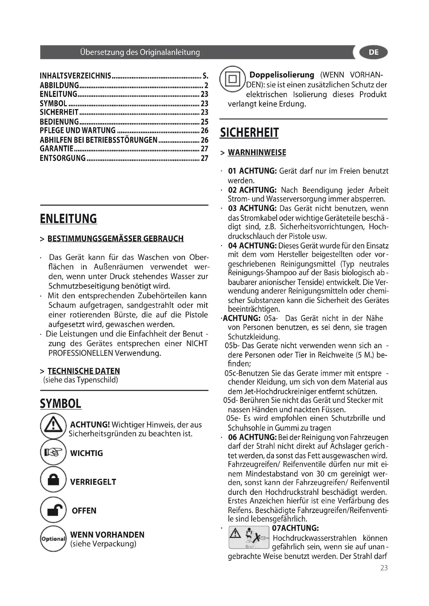 zung des Gerätes entsprechen einer NICHT PROFESSIONELLEN Verwendung. > TECHNISCHE DATEN (siehe das Typenschild) SYMBOL ACHTUNG! Wichtiger Hinweis, der aus Sicherheitsgründen zu beachten ist. WICHTIG VERRIEGELT OFFEN WENN VORHANDEN (siehe Verpackung) Doppelisolierung (WENN VORHAN- DEN): sie ist einen zusätzlichen Schutz der elektrischen Isolierung dieses Produkt verlangt keine Erdung. SICHERHEIT > WARNHINWEISE