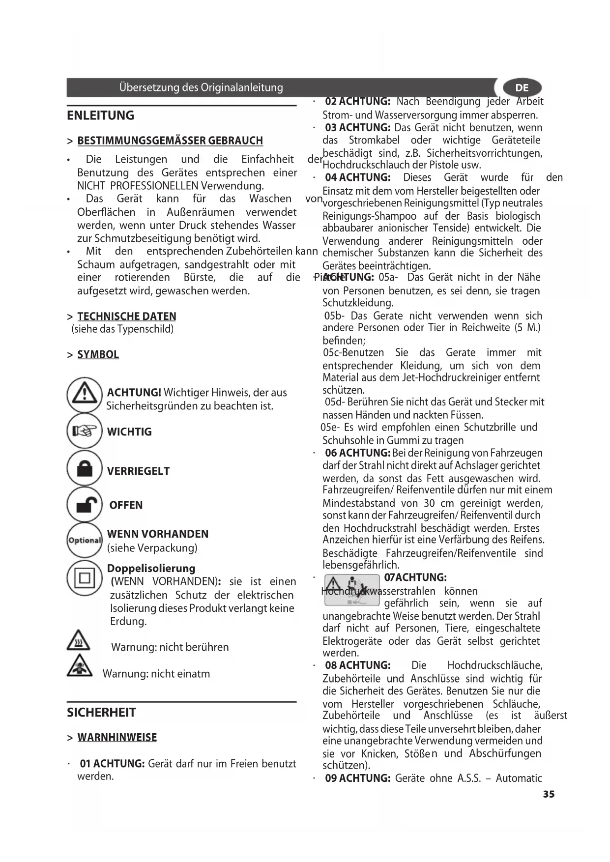 ACHTUNG: Es ist zu vermeiden, die Maschine unter dem Regen zu benutzen und den Hochdruckstrahl ge gen die Maschine selbst zu richten.