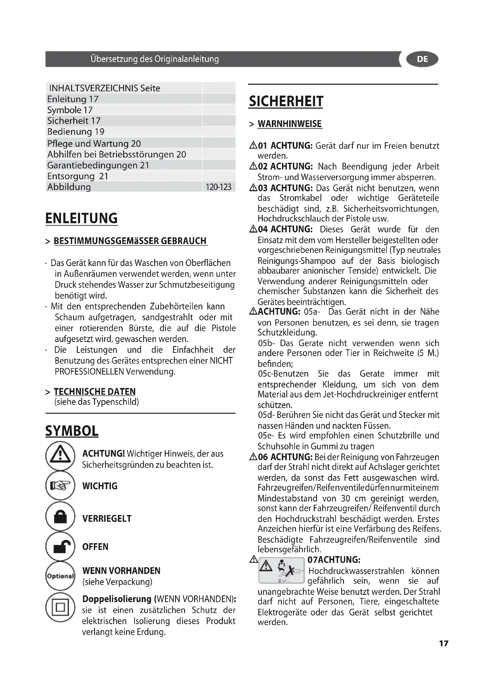 INHALTSVERZEICHNIS Seite Enleitung 17 Symbole 17 Sicherheit 17 Bedienung 19 Pege und Wartung 20 Abhilfen bei Betriebsstörungen 20 Garantiebedingungen 21 Entsorgung 21 Abbildung 120-123 ENLEITUNG > BESTIMMUNGSGEMäSSER GEBRAUCH