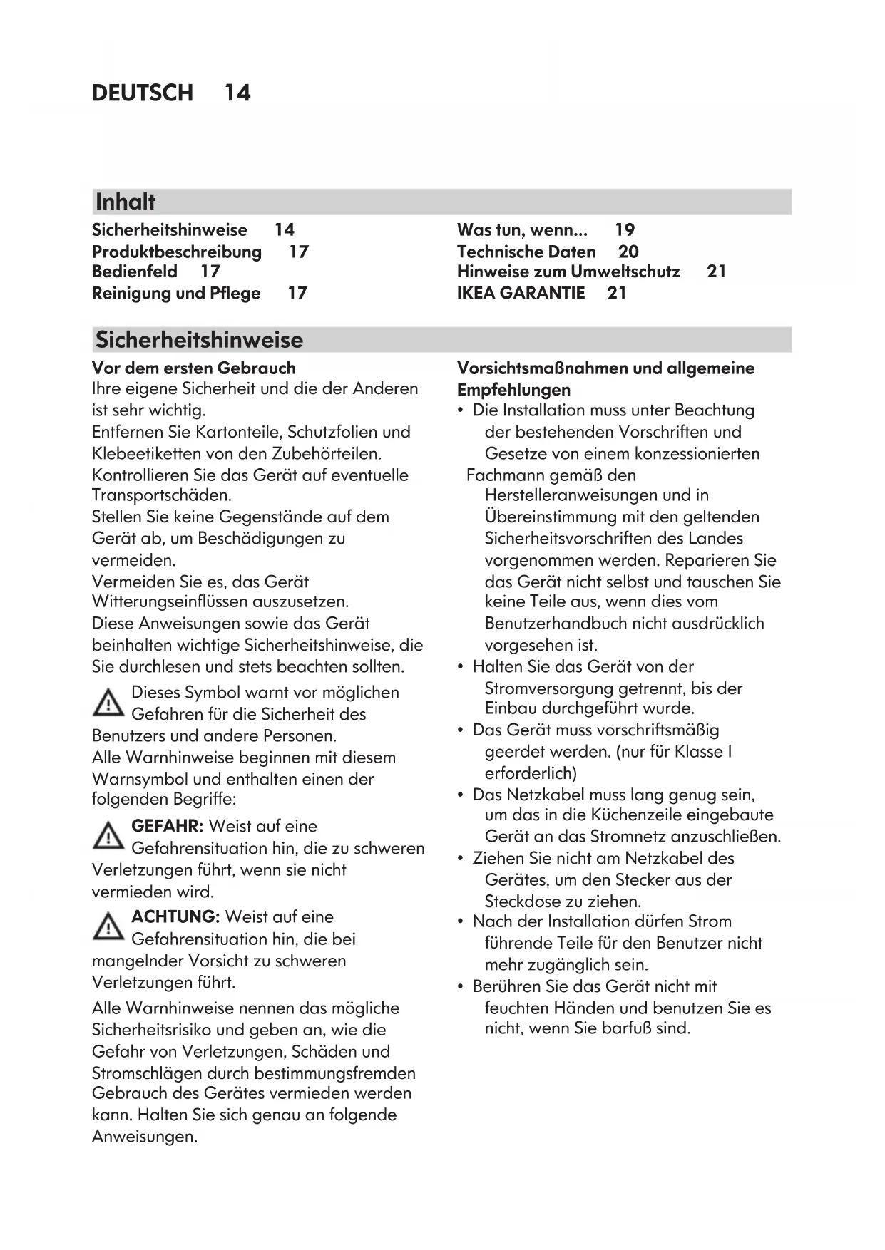 - Berühren Sie das Gerät nicht mit feuchten Händen und benutzen Sie es nicht, wenn Sie barfuß sind. Sicherheitshinweise 14 Produktbeschreibung 17 Bedienfeld 17 ReinigungundPege 17 Wastun,wenn... 19 TechnischeDaten 20 HinweisezumUmweltschutz 21 IKEAGARANTIE 21 Sicherheitshinweise InhaltDEUTSCH 15