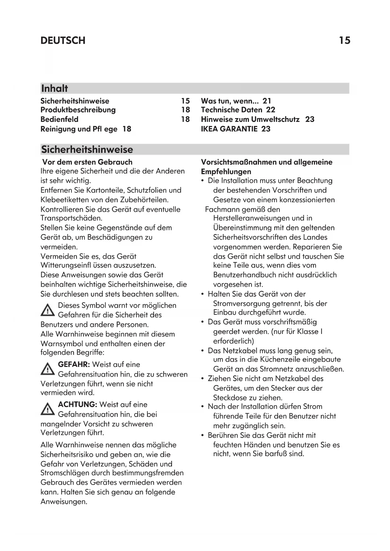 - Berühren Sie das Gerät nicht mit feuchten Händen und benutzen Sie es nicht, wenn Sie barfuß sind. Sicherheitshinweise 15 Produktbeschreibung 18 Bedienfeld 18 Reinigung und Pfl ege 18 Was tun, wenn... 21 Technische Daten 22 Hinweise zum Umweltschutz 23 IKEA GARANTIE 23 Sicherheitshinweise InhaltDEUTSCH 16