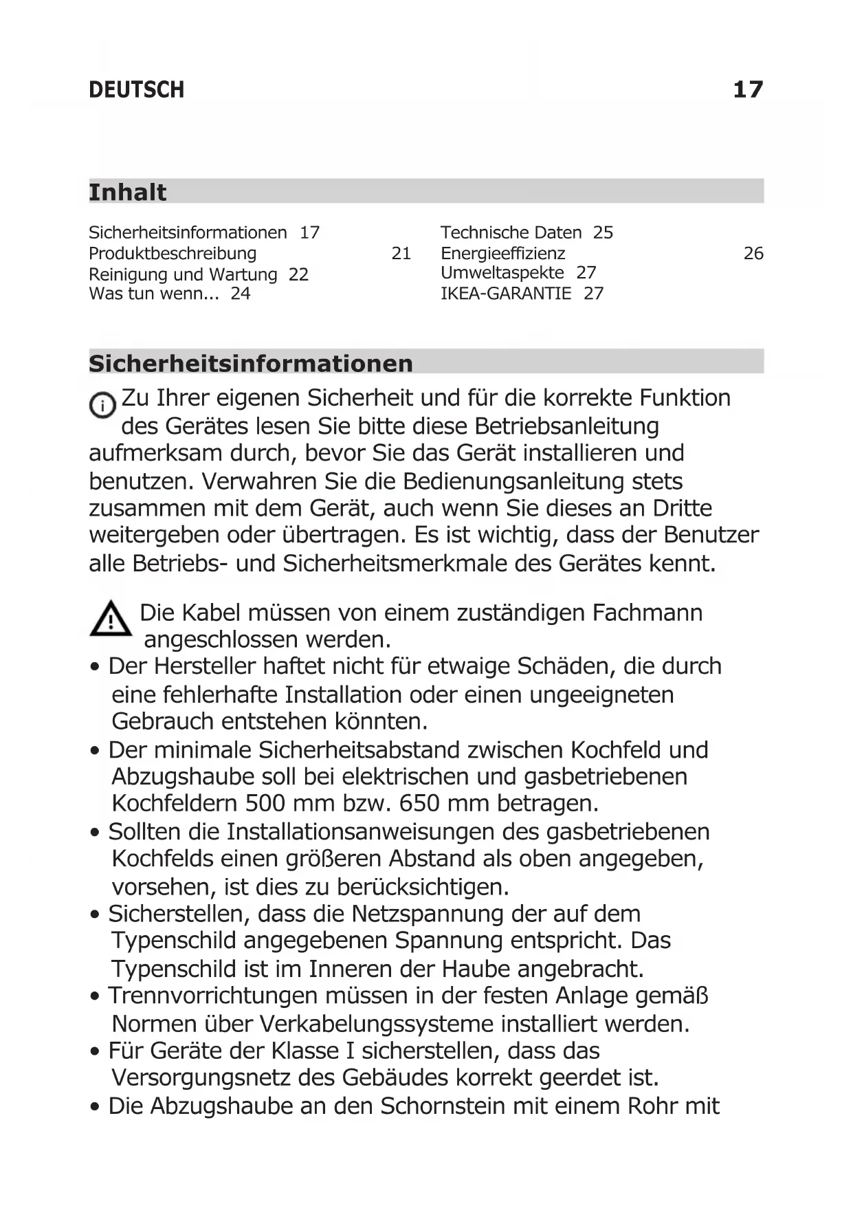 Jährlicher Stromverbrauch kWh/a 39,0 Steigungskoefzient der Zeit 0,6 Fluiddynamische Efzienz 37,6 Energieefzienzindex 39,9 Gemessener Luftvolumenstrom im Bestpunkt m3/h 384,0 Gemessener Luftdruck im Bestpunkt Pa 486 Maximaler Luftstrom m3/h 710,0 Gemessene elektrische Eingangsleistung im Bestpunkt W 138,0 Nennleistung des Beleuchtungssystems W 12,0 Durchschnittliche Beleuchtungsstärke des Beleuchtungs- systems auf der Kochoberäche lux 400 Gemessene Leistungsaufnahme im Bereitschaftszustand W N/A Gemessene Leistungsaufnahme im Aus-Zustand W 0,49 Schallleistungspegel bei maximaler Geschwindigkeit (ohne Intensivbetrieb) dBA 6027 DEUTSCH IKEA GARANTIE Wie lange gilt die IKEA-Garantie? Diese Garantie hat eine Gültigkeit von fünf (5) Jahren ab Kaufdatum des Ge- räts bei IKEA. Der Original-Kassenzettel ist als Kaufbeleg unerlässlich. Eine im Laufe der Garantie durchgeführte Repa- ratur verlängert die Garantiedauer des Geräts nicht. Wer übernimmt den Kundendienst? Der IKEA Kundendienst wird diesen Ser- vice über seinen eigenen Kundendienst oder über ein autorisiertes Partner-Netz- werk durchführen lassen. Was deckt die Garantie ab? Die Garantie deckt Material- und Produk- tionfehler ab. Sie gilt ab dem Datum, an dem das Elektrogerät bei IKEA gekauft wurde. Diese Garantie gilt nur für private Haushalte. Die Ausnahmen sind unter der Rubrik “ Was ist nicht durch diese Garantie abgedeckt?” beschrieben. Inner- halb des Garantiezeitraums werden die Kosten zur Behebung eines Fehlers wie Reparaturen, Ersatz- teile, Arbeitszeit und Fahrtkosten abgedeckt, vorausgesetzt, dass das Gerät ohne besonderen Kos- tenaufwand für die Reparatur zugänglich ist und dass der Fehler direkt auf einen Konstruktionsfehler oder einen Material- fehler zurückgeht, der durch die Garantie abgedeckt ist. Bei diesen Bedingungen gelten die EU-Richtlinien (Nr.99/44/EG) und die entsprechenden gesetzlichen Vor- schriften. Teile, die ersetzt wurden, gehen in das Eigentum von IKEA über. Was wird IKEA zur Lösung des Prob- lems tun? IKEA hat Kundendienste, die das Produkt untersuchen und eigenständig entschei- den, ob das Problem durch die Garantie abgedeckt ist oder nicht. Wenn entschie- den wird, dass der Fall unter die Garantie fällt, repariert der IKEA Kundendienst oder ein autorisierter Service-Partner über seinen eigenen Service eigenständig das defekte Produkt, oder sie ersetzen es durch ein gleiches oder durch ein gleich- wertiges Produkt. Was ist nicht durch diese Garantie abgedeckt?