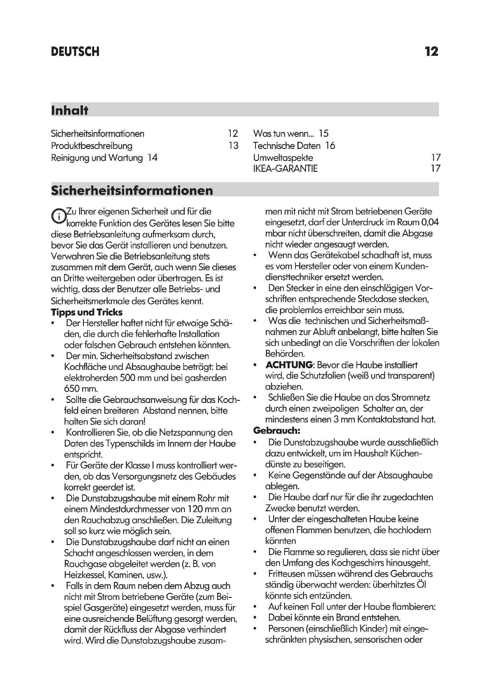 Max. Lärmpegel - Umluftbetrieb 72 dB(A) Min. Installationshöhe - Gaskochfeld 650 mm Min. Installationshöhe - Elektrokochfeld 500 mm Gewicht 12 Kg Dieses Gerät wurde gemäß den EU-Richtlinien entworfen, hergestellt und vermarktet. Die technischen Informationen in dem Typenschild auf der Innenseite des Geräts entfernt.17 deutsch IKEA GARANTIE Wie lang ist die IKEA Garantie gültig? Diese Garantie ist für (5) fünf Jahre gültig ab dem Originalkaufdatum Ihres Gerätes bei IKEA; sollte das Gerät die Bezeichnung “LAGAN” tragen, gilt die Garantie in diesem Fall nur (2) zwei Jahre. Als Kauf nach weis ist der Ori- ginalkassenbon oder die Originalrechnung erforderlich. Werden im Rahmen der Garantie Arbeiten ausgeführt, so verlängert sich dadurch die Garantie zeit weder für das Gerät noch für die neuen Teile. Welche Geräte sind nicht durch die IKEA (5) Fünfjahresgarantie abgedeckt? Die Geräte-Serie LAGAN und alle Geräte, die vor dem 1. August 2007 bei IKEA gekauft wurden. Wer übernimmt den Kundendienst? Der IKEA Kundendienst wird diesen Service über seinen eigenen Kundendienst oder über ein au- torisiertes Partner-Netzwerk durchführen lassen. Was deckt die Garantie ab? Die Garantie deckt Material- und Produkti- onfehler ab. Sie gilt ab dem Datum, an dem das Elektrogerät bei IKEA gekauft wurde. Diese Garantie gilt nur für private Haushalte. Die Ausnahmen sind unter der Rubrik “ Was ist nicht durch diese Garantie abgedeckt?” beschrieben. Innerhalb des Garantiezeitraums werden die Kosten zur Behebung eines Fehlers wie Repara- turen, Ersatz- teile, Arbeitszeit und Fahrtkosten abgedeckt, vorausgesetzt, dass das Gerät ohne besonderen Kostenaufwand für die Reparatur zugänglich ist und dass der Fehler direkt auf einen Konstruktionsfehler oder einen Mate- rialfehler zurückgeht, der durch die Garantie abgedeckt ist. Bei diesen Bedingungen gelten die EU-Richtlinien (Nr. 99/44/EG) und die entsprechenden gesetz- lichen Vorschriften. Teile, die ersetzt wurden, gehen in das Eigentum von IKEA über. Informationen zum Umweltschutz Instandhaltung