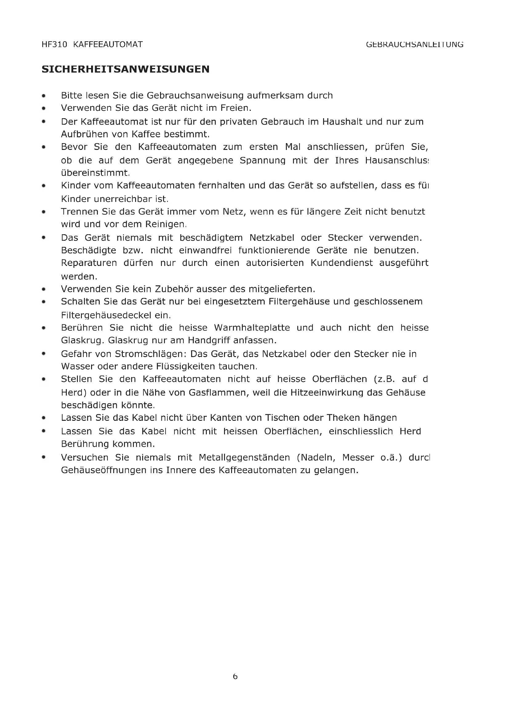 Versuchen Sie niemals mit Metallgegenständen (Nadeln, Messer o.ä.) durch Gehäuseöffnungen ins Innere des Kaffeeautomaten zu gelangen. HF310 KAFFEEAUTOMAT GEBRAUCHSANLEITUNG7 HF310 KAFFEEAUTOMAT GEBRAUCHSANLEITUNG BESCHREIBUNG