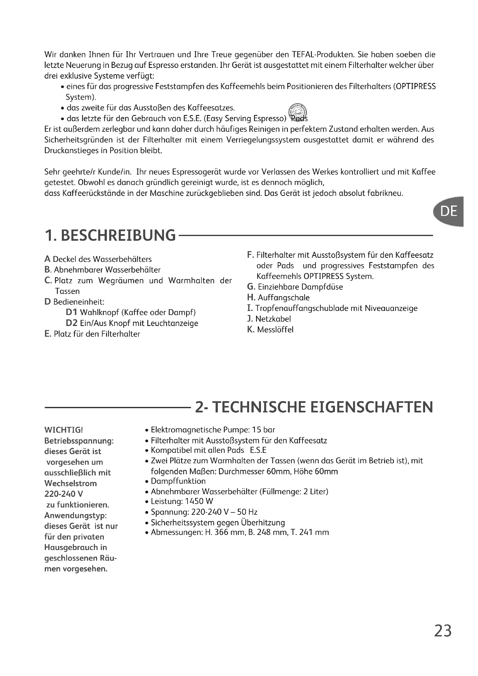 J. Netzkabel K. Messlöffel Wir danken Ihnen für Ihr Vertrauen und Ihre Treue gegenüber den TEFAL-Produkten. Sie haben soeben die letzte Neuerung in Bezug auf Espresso erstanden. Ihr Gerät ist ausgestattet mit einem Filterhalter welcher über drei exklusive Systeme verfügt: