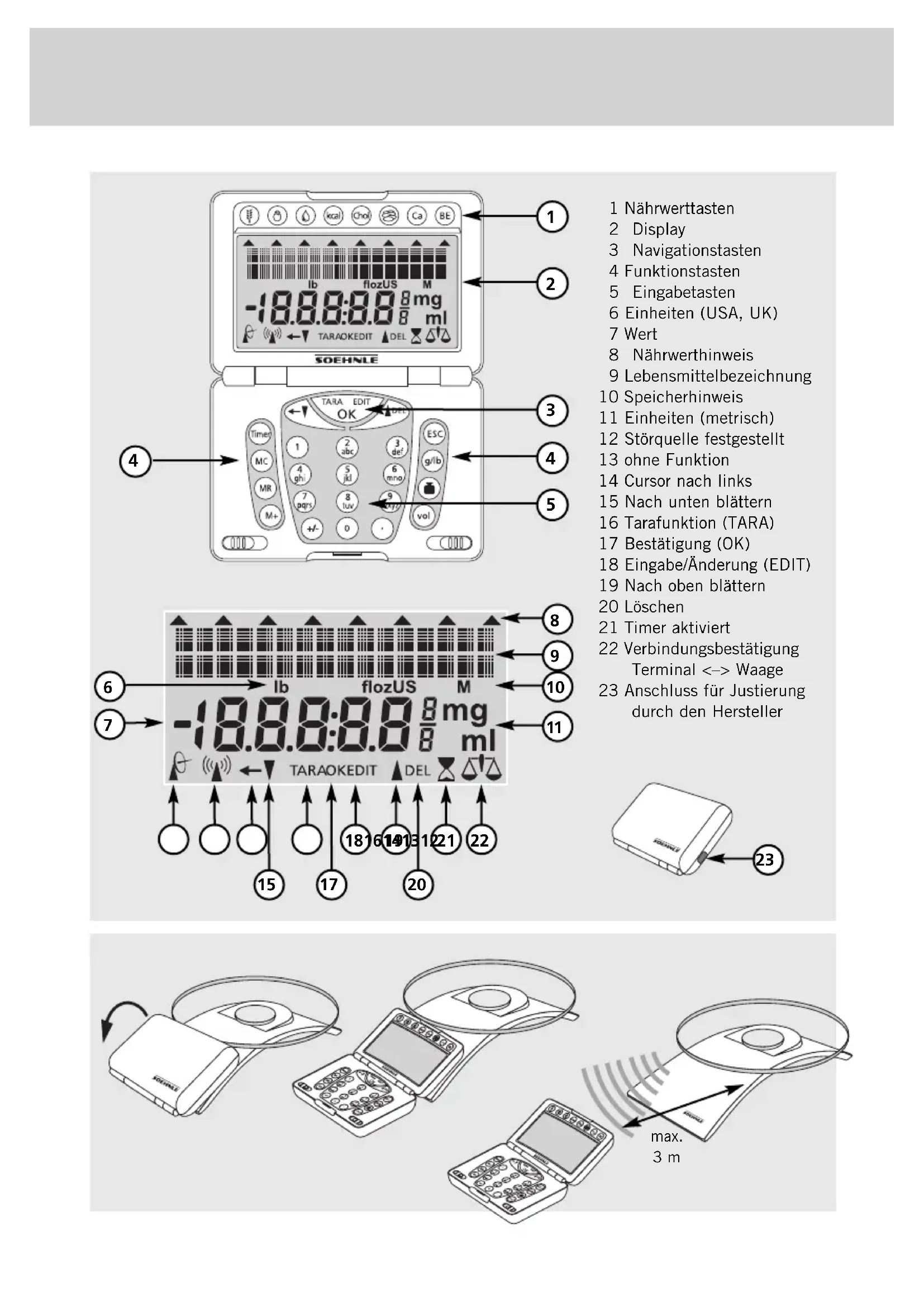 max. 3 m 1 Nährwerttasten 2 Display 3 Navigationstasten 4 Funktionstasten 5 Eingabetasten 6 Einheiten (USA, UK) 7 Wert 8 Nährwerthinweis 9 Lebensmittelbezeichnung 10 Speicherhinweis 11 Einheiten (metrisch) 12 Störquelle festgestellt 13 ohne Funktion 14 Cursor nach links 15 Nach unten blättern 16 Tarafunktion (TARA) 17 Bestätigung (OK) 18 Eingabe/Änderung (EDIT) 19 Nach oben blättern 20 Löschen 21 Timer aktiviert 22 Verbindungsbestätigung Terminal <–> Waage 23 Anschluss für Justierung durch den Hersteller