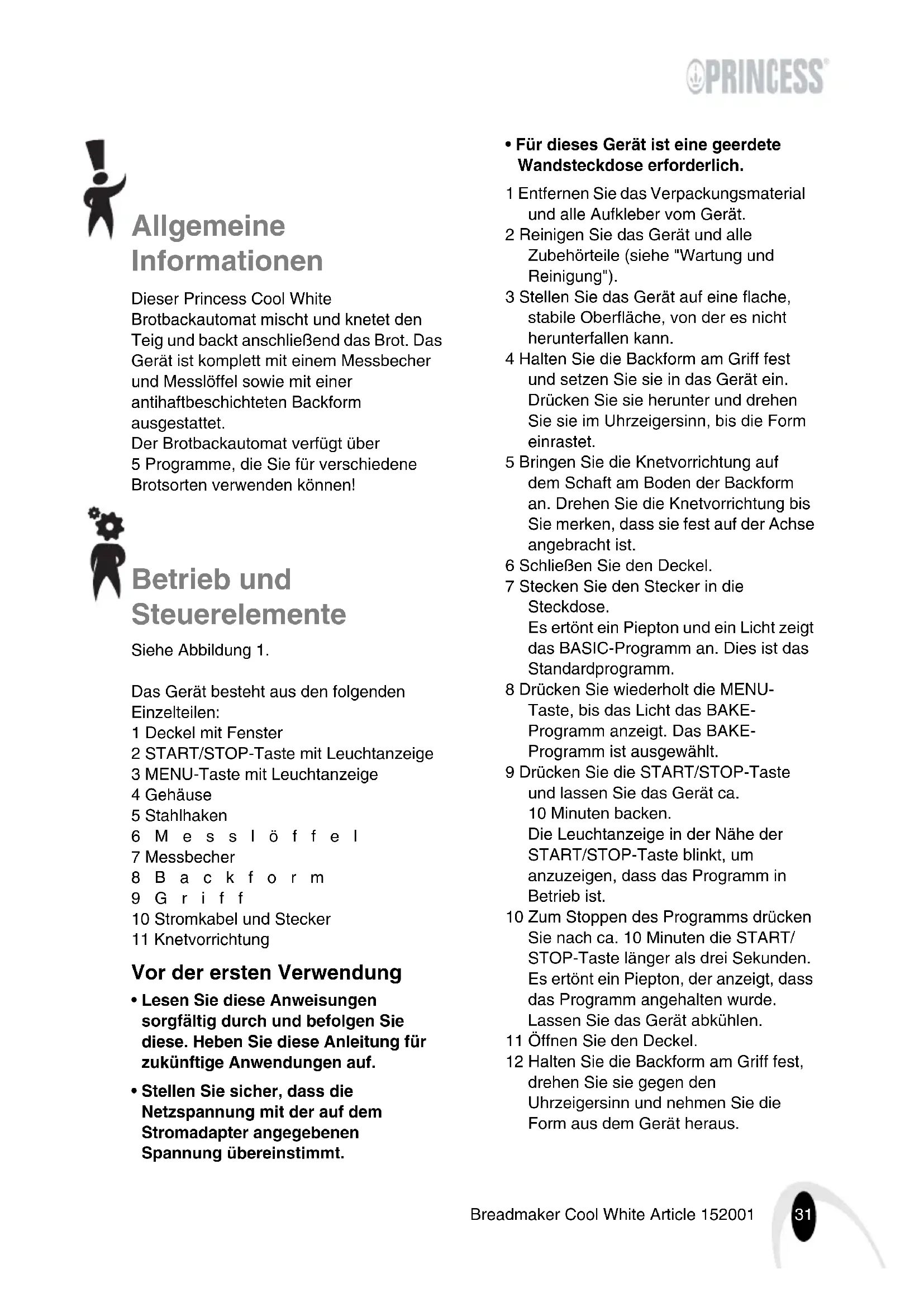 Finden Sie kostenlos die Bedienungsanleitung des Geräts 152001 PRINCESS als PDF.