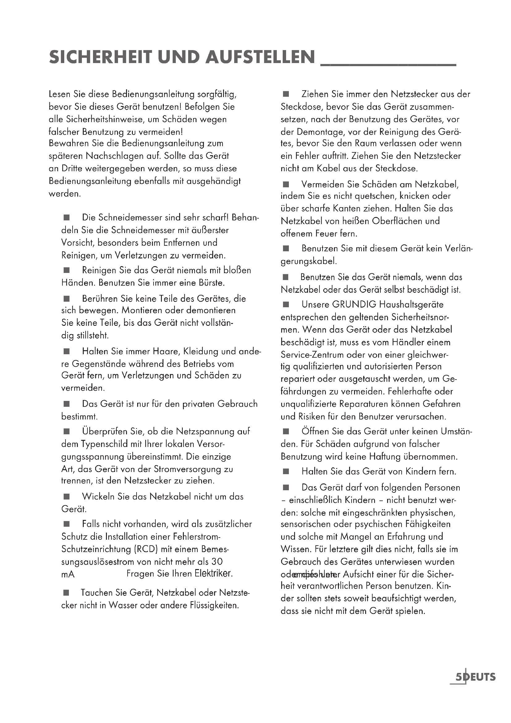 Lesen Sie diese Bedienungsanleitung sorgfältig, bevor Sie dieses Gerät benutzen! Befolgen Sie alle Sicherheitshinweise, um Schäden wegen falscher Benutzung zu vermeiden! Bewahren Sie die Bedienungsanleitung zum späteren Nachschlagen auf. Sollte das Gerät an Dritte weitergegeben werden, so muss diese Bedienungsanleitung ebenfalls mit ausgehändigt werden. Die Schneidemesser sind sehr scharf! Behan- deln Sie die Schneidemesser mit äußerster Vorsicht, besonders beim Entfernen und Reinigen, um Verletzungen zu vermeiden. Reinigen Sie das Gerät niemals mit bloßen Händen. Benutzen Sie immer eine Bürste. Berühren Sie keine Teile des Gerätes, die sich bewegen. Montieren oder demontieren Sie keine Teile, bis das Gerät nicht vollstän- dig stillsteht. Halten Sie immer Haare, Kleidung und ande- re Gegenstände während des Betriebs vom Gerät fern, um Verletzungen und Schäden zu vermeiden. Das Gerät ist nur für den privaten Gebrauch bestimmt. Überprüfen Sie, ob die Netzspannung auf dem Typenschild mit Ihrer lokalen Versor- gungsspannung übereinstimmt. Die einzige Art, das Gerät von der Stromversorgung zu trennen, ist den Netzstecker zu ziehen. Wickeln Sie das Netzkabel nicht um das Gerät. Falls nicht vorhanden, wird als zusätzlicher Schutz die Installation einer Fehlerstrom- Schutzeinrichtung (RCD) mit einem Bemes- sungsauslösestrom von nicht mehr als 30 mA empfohlen. Fragen Sie Ihren Elektriker. Tauchen Sie Gerät, Netzkabel oder Netzste- cker nicht in Wasser oder andere Flüssigkeiten. Ziehen Sie immer den Netzstecker aus der Steckdose, bevor Sie das Gerät zusammen- setzen, nach der Benutzung des Gerätes, vor der Demontage, vor der Reinigung des Gerä- tes, bevor Sie den Raum verlassen oder wenn ein Fehler auftritt. Ziehen Sie den Netzstecker nicht am Kabel aus der Steckdose. Vermeiden Sie Schäden am Netzkabel, indem Sie es nicht quetschen, knicken oder über scharfe Kanten ziehen. Halten Sie das Netzkabel von heißen Oberflächen und offenem Feuer fern. Benutzen Sie mit diesem Gerät kein Verlän- gerungskabel. Benutzen Sie das Gerät niemals, wenn das Netzkabel oder das Gerät selbst beschädigt ist. Unsere GRUNDIG Haushaltsgeräte entsprechen den geltenden Sicherheitsnor- men. Wenn das Gerät oder das Netzkabel beschädigt ist, muss es vom Händler einem Service-Zentrum oder von einer gleichwer- tig qualifizierten und autorisierten Person repariert oder ausgetauscht werden, um Ge- fährdungen zu vermeiden. Fehlerhafte oder unqualifizierte Reparaturen können Gefahren und Risiken für den Benutzer verursachen. Öffnen Sie das Gerät unter keinen Umstän- den. Für Schäden aufgrund von falscher Benutzung wird keine Haftung übernommen. Halten Sie das Gerät von Kindern fern. Das Gerät darf von folgenden Personen – einschließlich Kindern – nicht benutzt wer- den: solche mit eingeschränkten physischen, sensorischen oder psychischen Fähigkeiten und solche mit Mangel an Erfahrung und Wissen. Für letztere gilt dies nicht, falls sie im Gebrauch des Gerätes unterwiesen wurden oder dies unter Aufsicht einer für die Sicher- heit verantwortlichen Person benutzen. Kin- der sollten stets soweit beaufsichtigt werden, dass sie nicht mit dem Gerät spielen.6 DEUTSCH Lassen Sie das Gerät während der Benut- zung nicht unbeaufsichtigt. Seien Sie äußerst vorsichtig, wenn Sie das Gerät in der Nähe von Kindern und Personen mit eingeschränk- ten physischen, sensorischen oder mentalen Fähigkeiten benutzen. Reinigen Sie alle Teile, die mit Nahrung in Kontakt kommen vor der ersten Benutzung sorgfältig. Beachten Sie weitere Informatio- nen im Abschnitt „Reinigung und Pflege“. Trocknen Sie das Gerät und alle Teile, bevor Sie es an die Stromversorgung anschließen und Sie das Zubehör anbringen. Betreiben Sie das Gerät nicht ohne Zutaten im Messbecher oder in der Schüssel. Stellen Sie das Gerät, das Zubehör, das Netzkabel oder den Netzstecker niemals auf heiße Oberflächen wie Gasbrenner, elekt- rische Kochplatten heiße Öfen oder heiße Flüssigkeiten und Nahrungsmittel. Lassen Sie heiße Nahrungsmittel und Flüssigkeiten vor der Verarbeitung auf mindestens 80°C oder weniger abkühlen. Benutzen Sie das Gerät nicht für Zwecke, für die es nicht bestimmt ist. Schalten Sie das Gerät nie länger ein, als Sie benötigen, um die Nahrungsmittel zu verarbeiten. Benutzen Sie das Gerät nie mit feuchten oder nassen Händen. Betreiben Sie das Gerät nur mit den mitgelie- ferten Teilen. Das Gerät ist nur für die Verarbeitung norma- ler Haushaltsmengen ausgelegt. Benutzen Sie das Gerät nicht, wenn die Schneidemesser beschädigt sind oder Abnut- zungserscheinungen aufweisen. Stellen Sie die Schüssel immer auf eine stabi- le, ebene, saubere und trockene Oberfläche. Stolpern Sie nicht versehentlich über das Netzkabel, wenn das Gerät in Betrieb ist. Während des Betriebes sollte der Netzste- cker immer frei zugänglich sein. Entfernen Sie die Nahrungsmittel mit Hilfe eines Spatels aus der Schüssel. Gerät zuvor ausschalten! Dieses Gerät ist nicht zum Zerkleinern von Eiswürfeln und trockenen oder harten Nahrunsmitteln geeignet, die Schneidemes- ser werden dadurch stumpf. Entfernen Sie Knochen und Kerne aus den Speisen, um Beschädigungen der Schneid- klingen oder des Gerätes zu vermeiden. Um die Verletzungsgefahr zu verringern, stecken Sie die Schneidemesser des Gerätes niemals auf das Grundgerät, das Gerät nicht richtig aufgestellt ist. Stellen Sie sicher, dass die Abdeckung richtig sitzt, bevor Sie das Gerät einschalten. Das Gerät sollte nicht länger als 15 Sekun- den in Betrieb sein, wenn nichts verarbeitet wird. Dieses Gerät ist nur für eine kurze Betriebs- dauer geeignet und darf nicht länger als 1 Minute ( Stabmixer und Zerkleinerer) oder 3 Minuten (Rührbesen) ununterbrochen benutzt werden. Lassen Sie das Gerät nach der Benutzung ausreichend abkühlen.