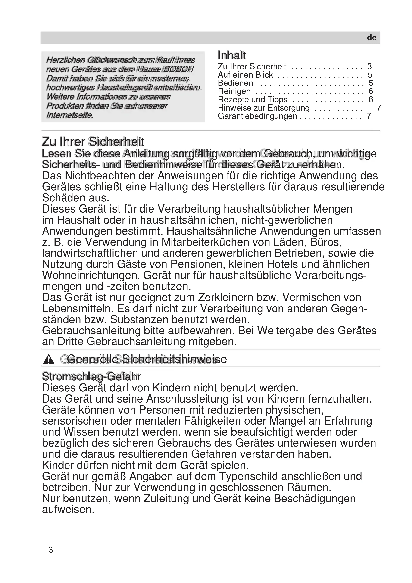 . . . . . . . . . . . . . . . . . . . . . . . . . . . . . . . . . . . . . . . . . . . . . . . . . . . .Robert Bosch Hausgeräte GmbH 3 Inhalt Zu Ihrer Sicherheit . . . . . . . . . . . . . . . . 3Auf einen Blick . . . . . . . . . . . . . . . . . . . 5Bedienen . . . . . . . . . . . . . . . . . . . . . . . 5Reinigen . . . . . . . . . . . . . . . . . . . . . . . . 6Rezepte und Tipps . . . . . . . . . . . . . . . . 6 Hinweise zur Entsorgung . . . . . . . . . . . 7 Garantiebedingungen . . . . . . . . . . . . . . 7 Zu Ihrer Sicherheit Lesen Sie diese Anleitung sorgfältig vor dem Gebrauch, um wichtige Sicherheits- und Bedienhinweise für dieses Gerät zu erhalten. Das Nichtbeachten der Anweisungen für die richtige Anwendung des Gerätes schließt eine Haftung des Herstellers für daraus resultierende Schäden aus. Dieses Gerät ist für die Verarbeitung haushaltsüblicher Mengen im Haushalt oder in haushaltsähnlichen, nicht-gewerblichen Anwendungen bestimmt. Haushaltsähnliche Anwendungen umfassen z. B. die Verwendung in Mitarbeiterküchen von Läden, Büros, landwirtschaftlichen und anderen gewerblichen Betrieben, sowie die Nutzung durch Gäste von Pensionen, kleinen Hotels und ähnlichen Wohneinrichtungen. Gerät nur für haushaltsübliche Verarbeitungs- mengen und -zeiten benutzen. Das Gerät ist nur geeignet zum Zerkleinern bzw. Vermischen von Lebensmitteln. Es darf nicht zur Verarbeitung von anderen Gegen- ständen bzw. Substanzen benutzt werden. Gebrauchsanleitung bitte aufbewahren. Bei Weitergabe des Gerätes an Dritte Gebrauchsanleitung mitgeben. , Generelle Sicherheitshinweise Stromschlag-Gefahr Dieses Gerät darf von Kindern nicht benutzt werden. Das Gerät und seine Anschlussleitung ist von Kindern fernzuhalten. Geräte können von Personen mit reduzierten physischen, sensorischen oder mentalen Fähigkeiten oder Mangel an Erfahrung und Wissen benutzt werden, wenn sie beaufsichtigt werden oder bezüglich des sicheren Gebrauchs des Gerätes unterwiesen wurden und die daraus resultierenden Gefahren verstanden haben. Kinder dürfen nicht mit dem Gerät spielen. Gerät nur gemäß Angaben auf dem Typenschild anschließen und betreiben. Nur zur Verwendung in geschlossenen Räumen. Nur benutzen, wenn Zuleitung und Gerät keine Beschädigungen aufweisen.