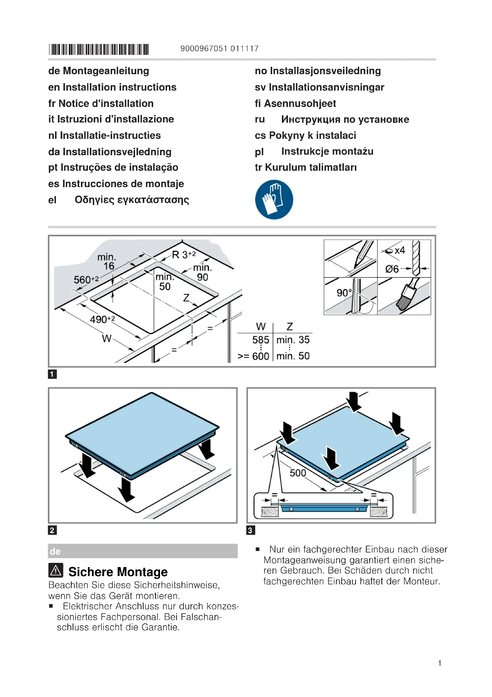 ¡ Das Kochfeld kann auch in einen vorhandenen 500mm tiefen Ausschnitt eingebaut werden. ¡ Es muss vorn und hinten gleich weit überstehen.