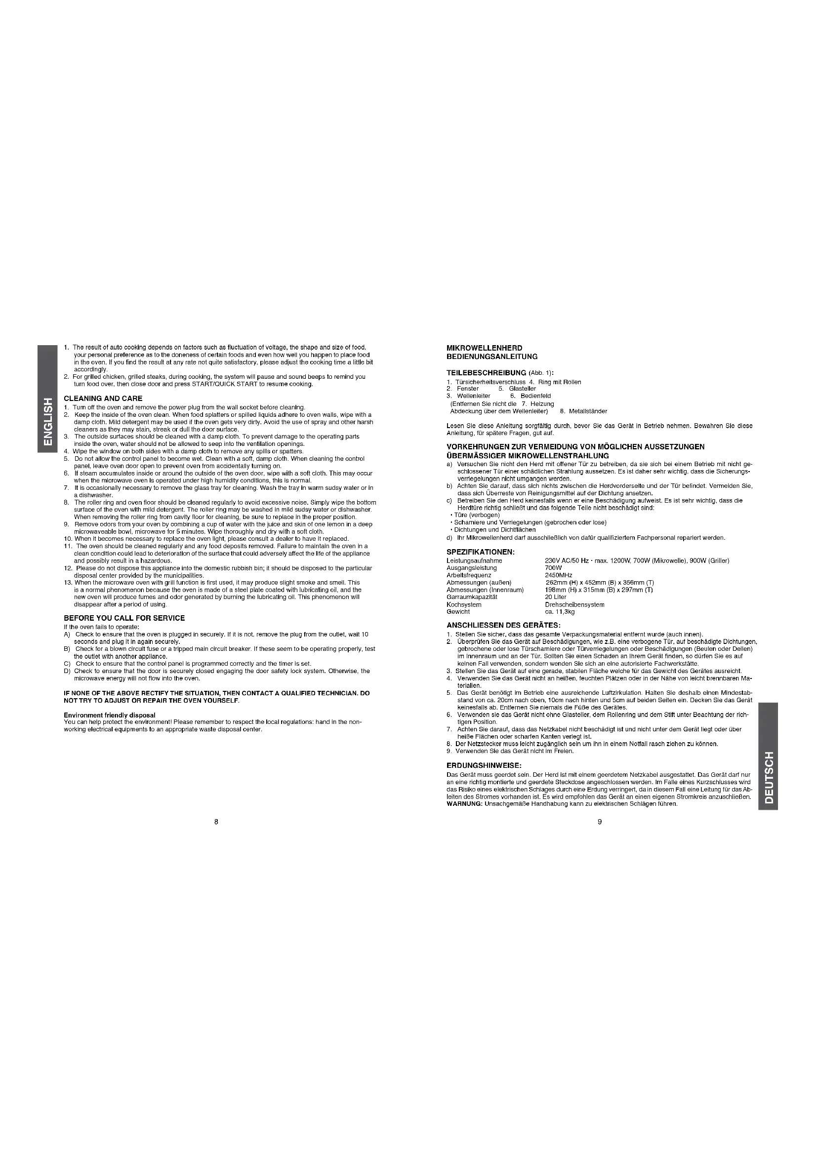 - Dichtungen und Dichtächen d) Ihr Mikrowellenherd darf ausschließlich von dafür qualiziertem Fachpersonal repariert werden. SPeZiFiKATionen: Leistungsaufnahme 230V AC/50 Hz • max. 1200W, 700W (Mikrowelle), 900W (Griller) Ausgangsleistung 700W Arbeitsfrequenz 2450MHz Abmessungen (außen) 262mm (H) x 452mm (B) x 356mm (T) Abmessungen (Innenraum) 198mm (H) x 315mm (B) x 297mm (T) Garraumkapazität 20 Liter Kochsystem Drehscheibensystem Gewicht ca. 11,3kg