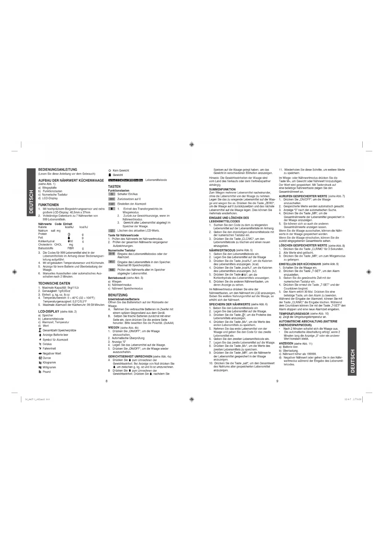 bestimmt, keine gewerbliche oder medizinische Nutzung. DEUTSCH DEUTSCH LEBENSMITTELLISTE FÜR DIE ELEKTRONISCHE DIÄTWAAGECode Lebensmittel BROT Brot, Getreide, Pasta & Reis1 Bagel, natur2 Bagel, Zimt-Rosinen3 Bagel, Ei4 Bananenbrot, Rezept, Margarine5 Gerste, geschält, nicht gekocht6 Biskuit, nature oder mit Buttermilch, Rezept, 2% Milch7 Biskuit, gekühlter Teig, gebacken, normal Brot8 Geschälter Weizen9 Eibrot10 Französisch, Wiener, Sauerteig11 Frittiertes Indianerbrot (Fry Bread oder Naan)12 Italienisches Brot13 Gemischtes Getreide, ungetoastet14 Haferocken, ungetoastet15 Fladenbrot16 Pumpernickel, ungetoastet17 Rosinenbrot, ungetoastet18 Roggen, ungetoastet19 Roggen, mit wenig Kalorien20 Weizen, ungetoastet21 Weizen, mit wenig Kalorien22 Weiß, ungetoastet23 Weiß, weiche Samen24 Weiß, mit wenig Kalorien25 Vollweizen, ungetoastet 26 Brotkrumen, trocken, gerieben, natur, angereichert27 Brotkrumen, trocken, gerieben, gewürzt, nicht angereichert28 Brotfüllung, trockene Mischung Frühstück/Müsliriegel29 Frühstücksriegel, mit Getreidekruste, Fruchtfüllung, fettfrei30 Müsliriegel, hart, natur31 Müsliriegel, weich, ohne Kruste, Schokoladenstückchen32 Müsliriegel, weich, ohne Kruste, Rosinen33 Nutri Grain Getreideriegel, mit Früchten34 Bulgur, gekocht35 Maisbrot, gemischt36 Maisbrot, Rezept, 2% Milch37 Maismehl, gelb, trocken, Vollkorn38 Maismehl, entkeimt, angereichert39 Maisstärke40 Couscous, ungekocht41 Croutons, gewürzt42 Englische Mufns, natur, ungetoastet43 Französischer Toast, Rezept, 2% Milch, gebraten in Margarine44 Französischer Toast, gefroren Mehl45 Brotmehl, angereichert46 Buchweizen Mehl, Vollkorn47 Kuchen- oder Gebäckmehl, angereichert, ungesiebt, gelöffelt48 Maismehl, Masa, angereichert49 Selbst angepanzt, angereichert, ungesiebt, gelöffelt50 Weizenmehl, für alle Zwecke, angereichert, gesiebt, gelöffelt51 Weizenmehl, für alle Zwecke, angereichert, ungesiebt, gelöffelt52 Matzen, natur 53 Mufns, Blaubeere, Handelsüblich54 Mufns, Blaubeere, gemischt55 Mufns, Kleie mit Rosinen56 Mufns, Mais, Handelsüblich57 Mufns, Maismischung58 Mufns, Haferkleie, Handelsüblich59 Haferkleie, ungekocht60 Pfannkuchen, gefroren, servierfertig61 Pfannkuchen, Fertigmischung62 Pfannkuchen, Mischung, 2% Milch, Ei & Öl63 Pastete ohne Füllung, gebacken, Rezept64 Pastete ohne Füllung, gebacken, gefroren65 Pastete ohne Füllung, Graham Kräcker 66 Apfel67 Blaubeere68 Kirsch69 Schokoladencrème70 Zitronenschaumgebäck71 Pekanuss72 Kürbis73 Rollen, Abendessen74 Rollen, Hamburger oder Hot Dog75 Süße Rollen, Zimt mit Rosinen, Handelsüblich76 Süße Rollen, Zimt, tiefgefrorener Teig, gebacken mit Zuckerguss77 Taco Hülle, gebacken78 Tapioka, Perle, abgetropft79 Toastgebäck, Früchte80 Toastgebäck, fettreduziert81 Tortilla, kochfertig, Mais82 Tortilla, kochfertig, Mehl83 Waffeln, natur, Rezept84 Waffeln, natur, gefroren, getoastet85 Waffeln, natur, fettreduziert86 Vollweizen, Hartweizen, gerührt, gelöffelt87 Weizenkeime, getoastet natur Getreide, gekocht88 Maisgrütze, weiß89 Maisgrütze, gelb90 Maisgrütze, Instant, natur91 das Beste vom Weizen, normal92 das Beste vom Weizen, schnell93 das Beste vom Weizen, Mischung, servierfertig, natur94 Hafermehl, Instant, gestärkt, natur95 Hafermehl, Instant, Apfel & Zimt96 Hafermehl, Instant, Ahorn & Brauner Zucker97 Hafermehl, normal, schnell oder Instant, nature, ungestärkt98 Weizen Getreide, verzehrfertig99 Alle Kleie100 Apfel-Zimt, Cheerios101 Apple Jacks102 Basic 4103 Cap‘N Crunch104 Cheerios105 Chex, Mais106 Chex, Honig-Nuss107 Chex, verschiedene Kleie108 Chex, Reis109 Chex, Weizen110 Zimt 111 Kakaokrispies112 Kakao Puffs113 Reine Weizenkleieocken114 Cornakes, General Mills, Total115 Cornakes, Kelloggs116 Mais Pops117 Crispix118 Froot Loops119 Gezuckerte Flocken120 Gezuckerte Mini Weizenpäckchen, normal121 Gezuckerte Mini Weizenpäckchen, Mundgröße122 Golden Grahams123 Honig-Nuss Cheerios124 Honig-Nuss Clusters125 Kix126 Life127 Nature Valley, Müsli128 100% Natürliches Müsli, Hafer, Honig und Rosinen129 100% Natürliches Müsli, Hafer, Honig und Rosinen, fettreduziert130 Produkt 19131 Puffreis132 Puffweizen133 Rosinenkleie, General Mills, Total134 Rosinenkleie, Kelloggs135 Rosinen-Nusskleie136 Reiskrispies137 Gehackter Weizen138 Special K139 Geröstete Haferocken, Quäker, Honig-Nuss140 Voll, Vollkorn141 Wheaties Pasta142 Makkaroni (gebogen), angereichert, gekocht143 Nudeln, Chow Mian, in Dose144 Nudeln (Ei), angereichert, gekocht, normal145 Nudeln (Ei), angereichert, gekocht, Spinat146 Nudeln, japanische, Soba, gekocht147 Pasta, tiefgefroren, natur, gekocht148 Spaghetti, gekocht, angereichert149 Spaghetti, Vollweizen, gekocht Reis150 Reis, Nudeln, gekocht151 Reis, braun, Langkorn, gekocht152 Weißer Langkorn, roh153 Weißer Langkorn, gekocht154 Weißer Langkorn, Instant155 vorgekocht, roh156 vorgekocht, gekocht157 Wildreis, gekocht158 Reiskuchen, brauner Reis, natur Gemüse159 Alfalfa Sprossen, roh160 Artischocken, gekocht, abgetropft161 Spargel, roh, gekocht, abgetropft162 Spargel, gefroren, gekocht, abgetropft163 Spargel, in Dose, Spitzen, abgetropft164 Bambussprossen, in Dose, abgetropft Bohnen165 Bohnensprossen, roh166 Bohnensprossen, gekocht, abgetropft167 Augenbohnen, roh, gekocht, abgetropft168 Augenbohnen, gefroren, gekocht, abgetropft169 Limabohnen, Ford Hooks, gefroren, gekocht, abgetropft170 Limabohnen, gefroren, gekocht, abgetropft171 Knackerbsen, grün, roh, gekocht, abgetropft172 Knackerbsen, gelb, roh, gekocht, abgetropft173 Knackerbsen, grün, gefroren, gekocht, abgetropft174 Knackerbsen, gelb, gefroren, gekocht, abgetropft175 Knackerbsen, grün, in Dose, abgetropft176 Knackerbsen, gelb, in Dose, abgetropft Rüben 177 Scheiben, gekocht, abgetropft178 Ganz, gekocht, abgetropft179 Scheiben, in Dose, abgetropft180 Ganz, in Dose, abgetropft181 Grün, Blätter & Stängel, gekocht, abgetropft Broccoli182 Roh, geschnitten oder gewürfelt183 Roh, Spitzen184 Roh, ganzer Kopf185 Roh, gekocht, abgetropft, gesc